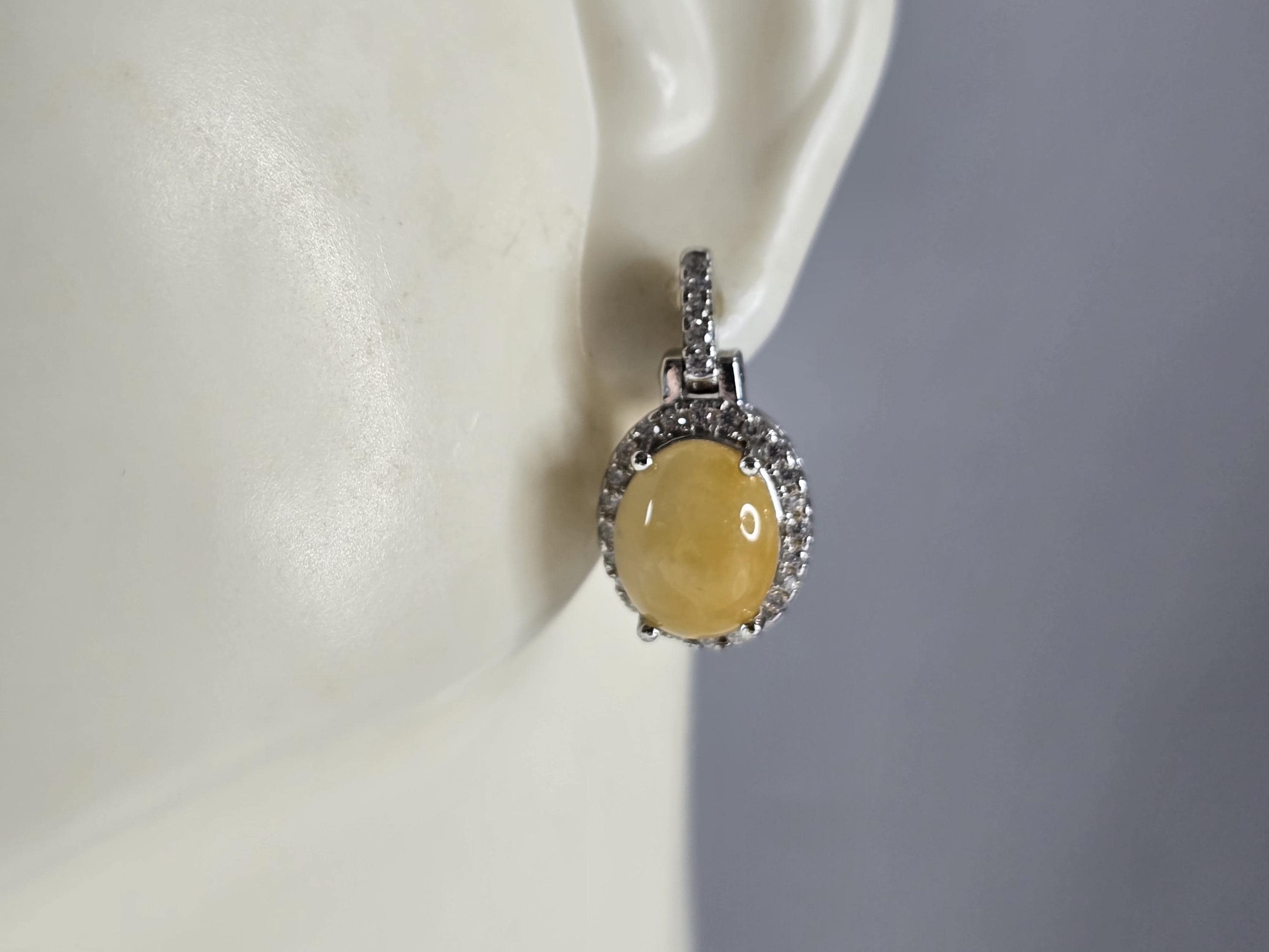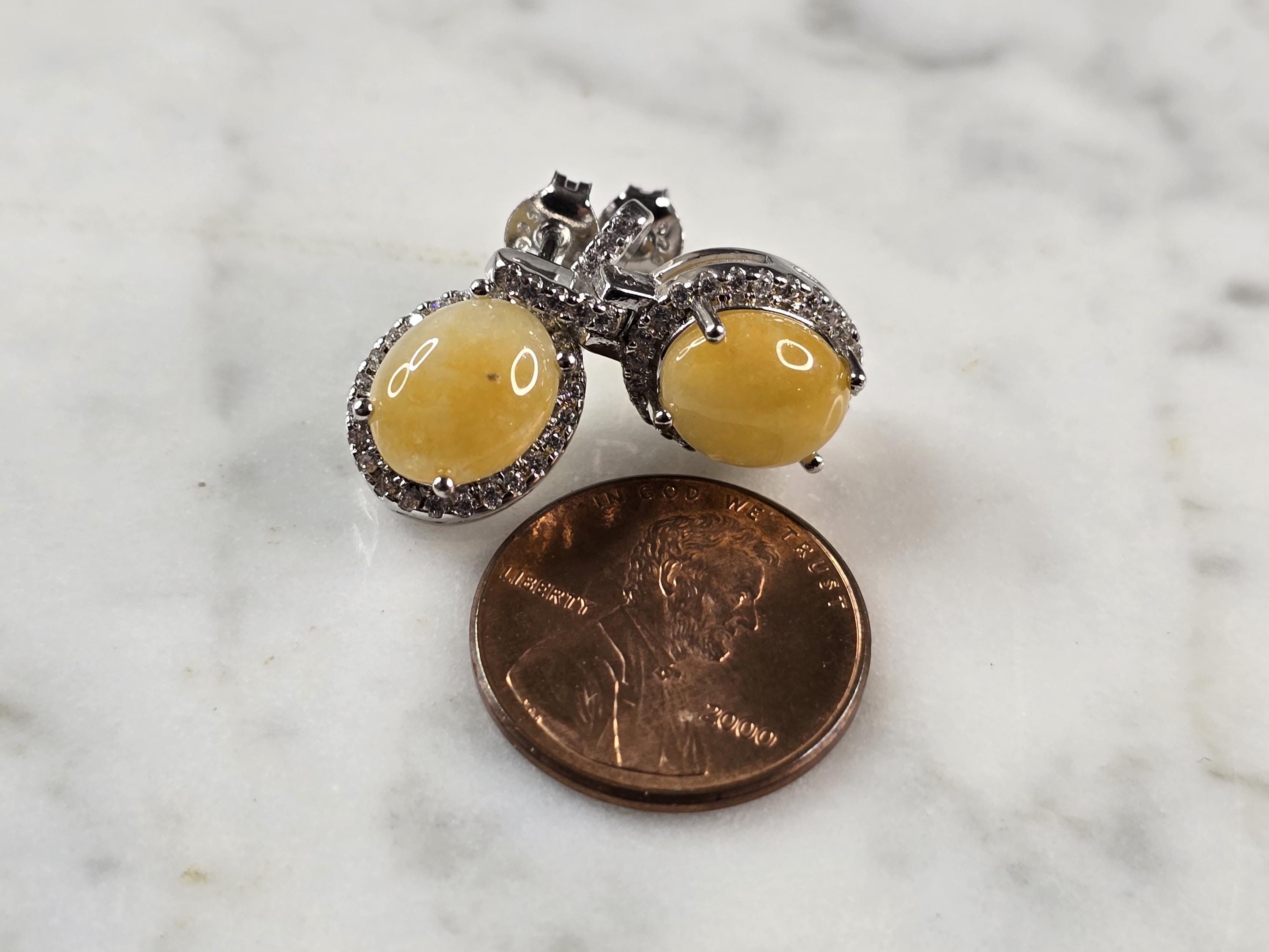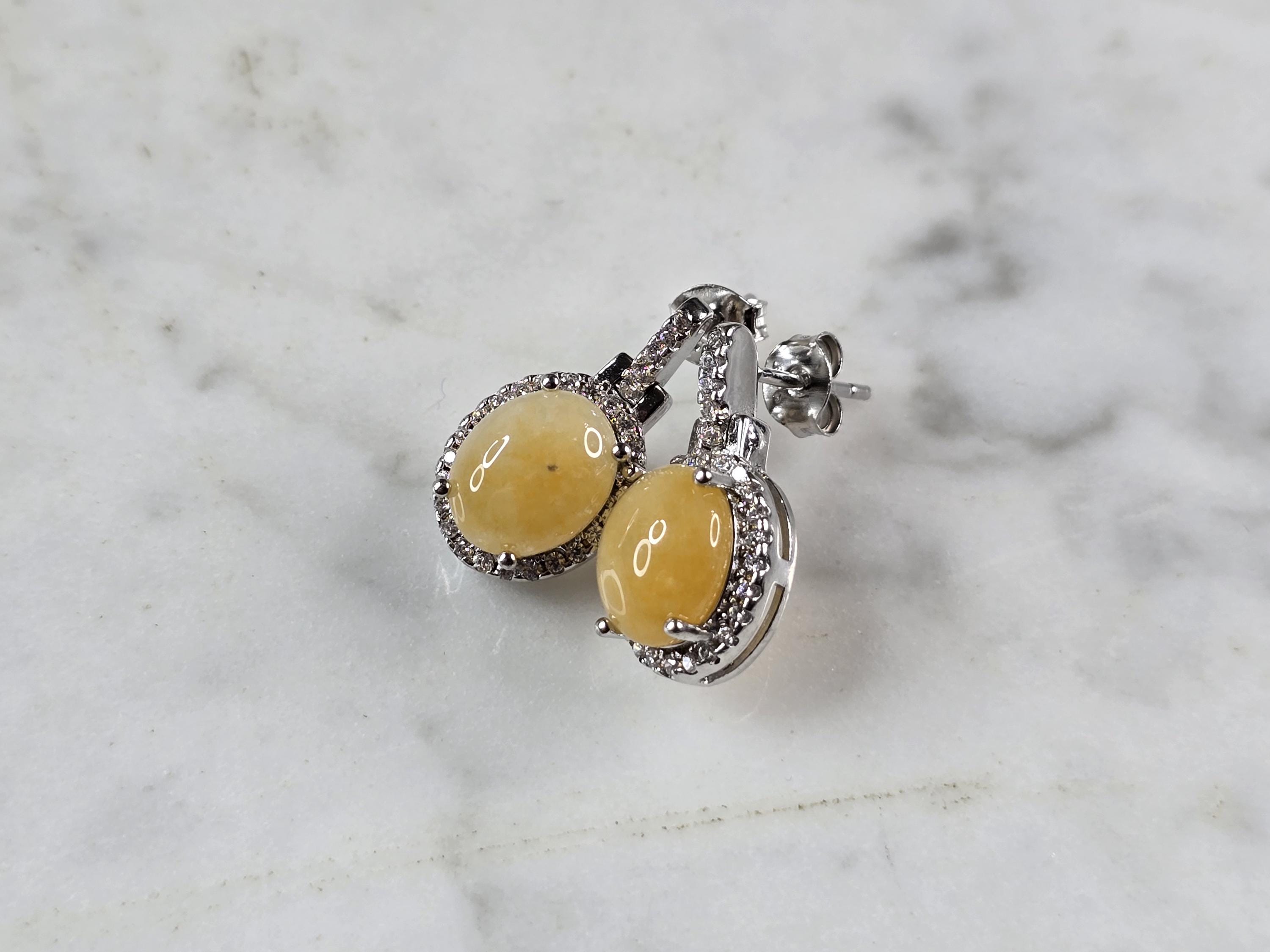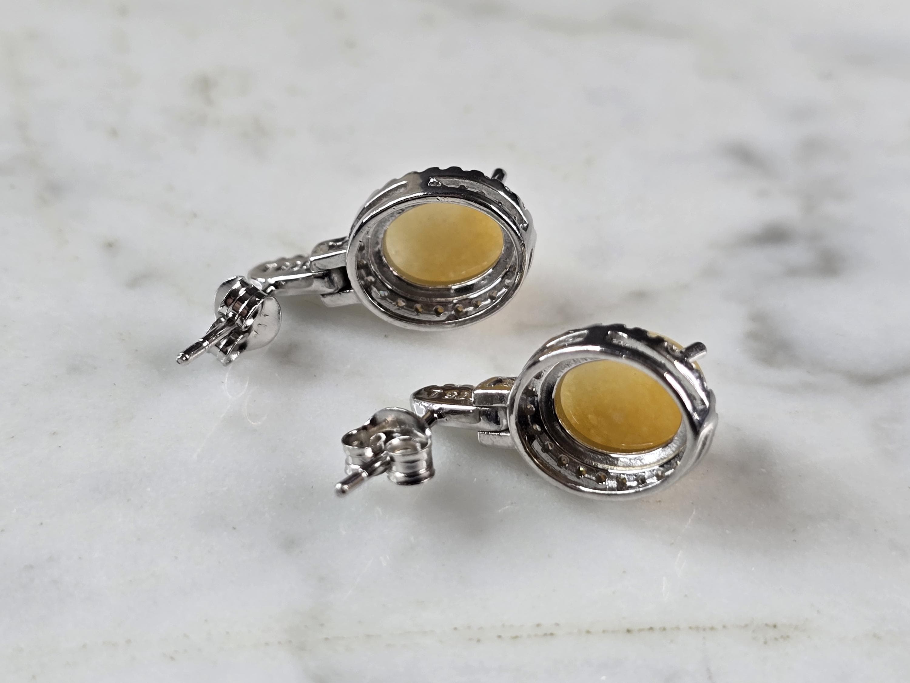 A PAIR OF WOMENS VINTAGE ESTATE STERLING SILVER CALCITE CABOCHON COLORED EARRINGS. NOT SURE IF STONES ARE NATURAL OR MAN MADE. THE EARRINGS WEIGH 4.3g AND MEASURE 3/4" LONG BY 1/2" WIDE. ANY QUESTIONS PLEASE DO NOT HESITATE TO ASK. BE SURE TO CHECK OUT SOME OF OUR OTHER GREAT PIECES OF JEWELRY FOR SALE. THANK YOU.
