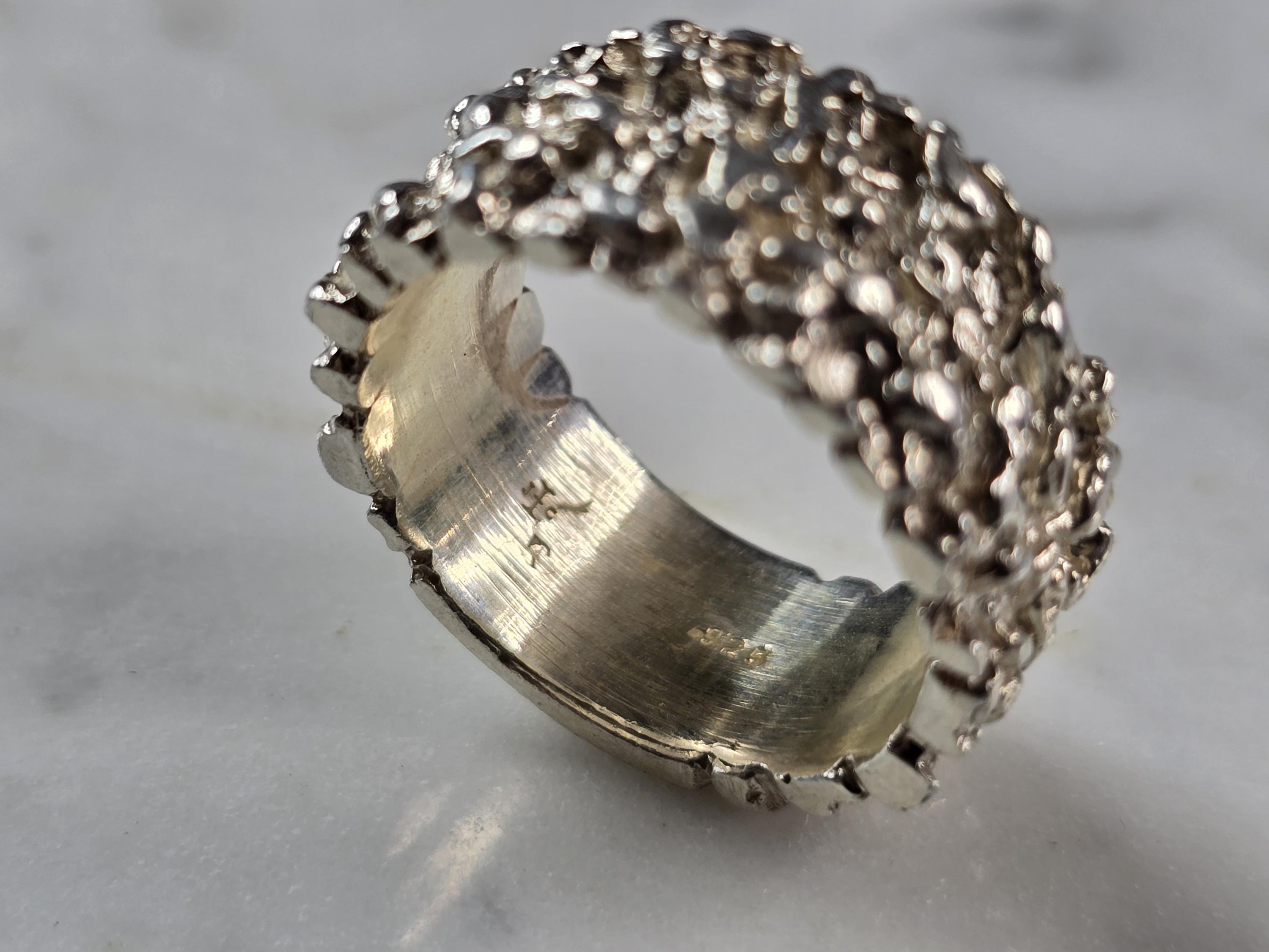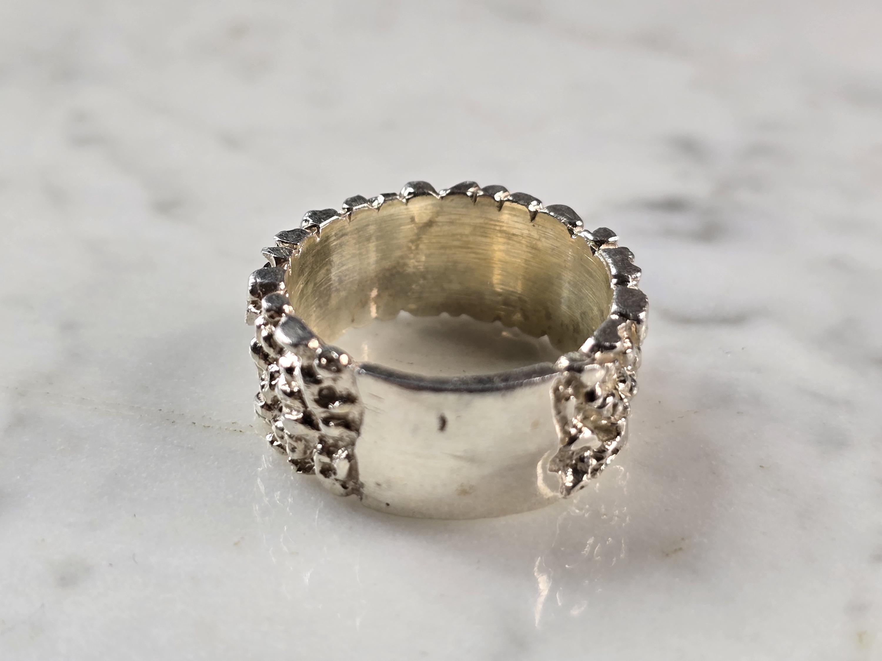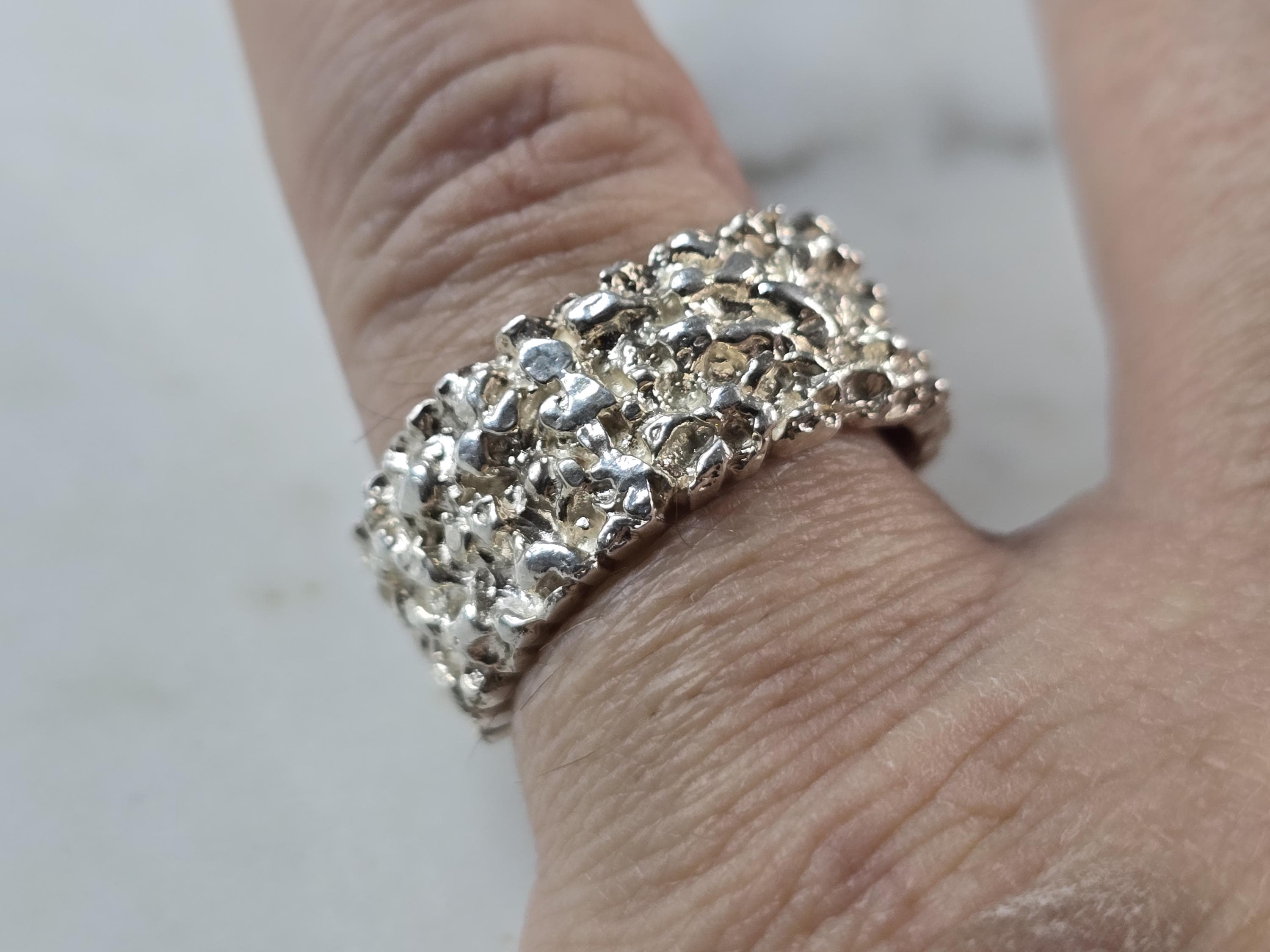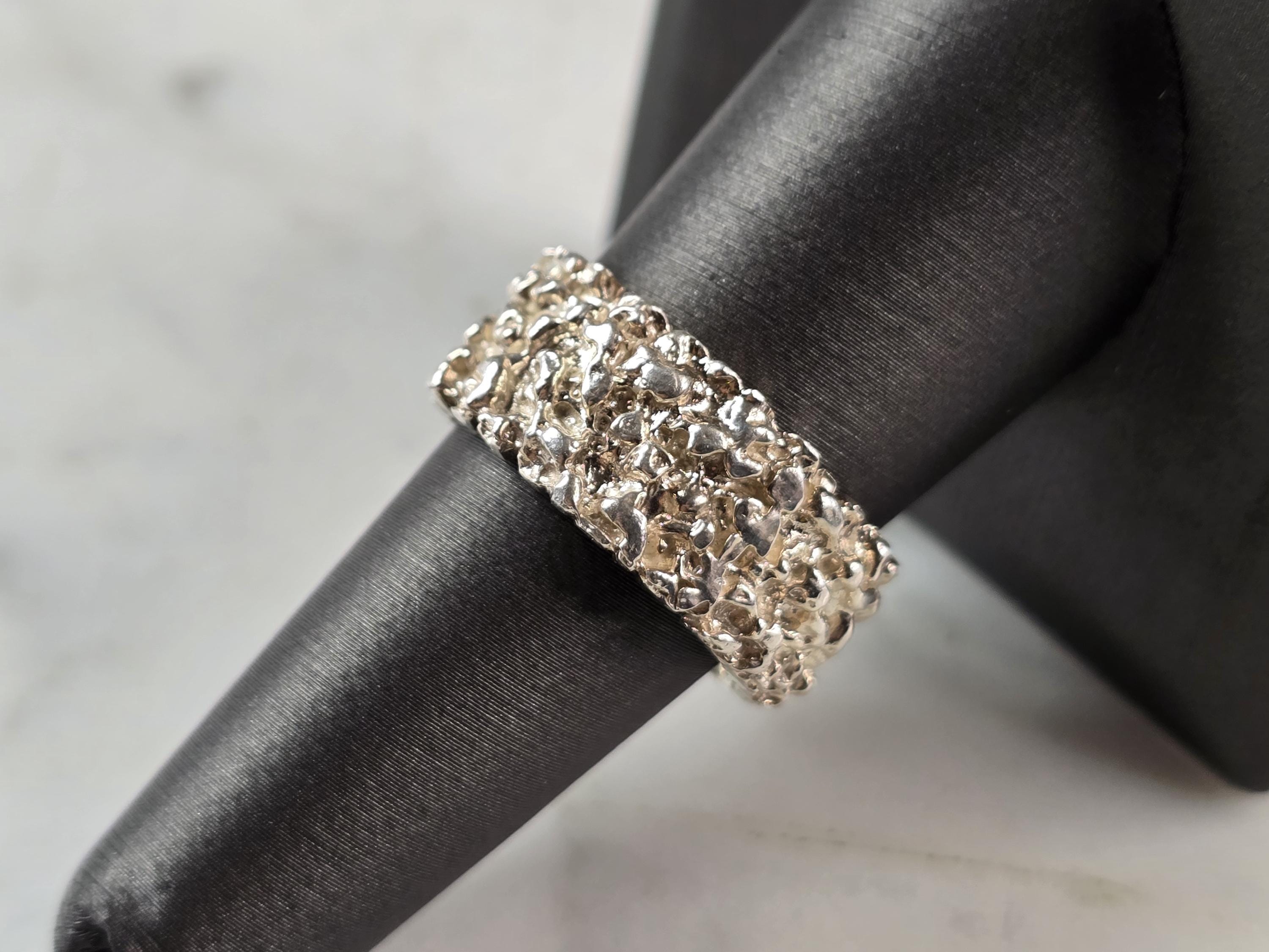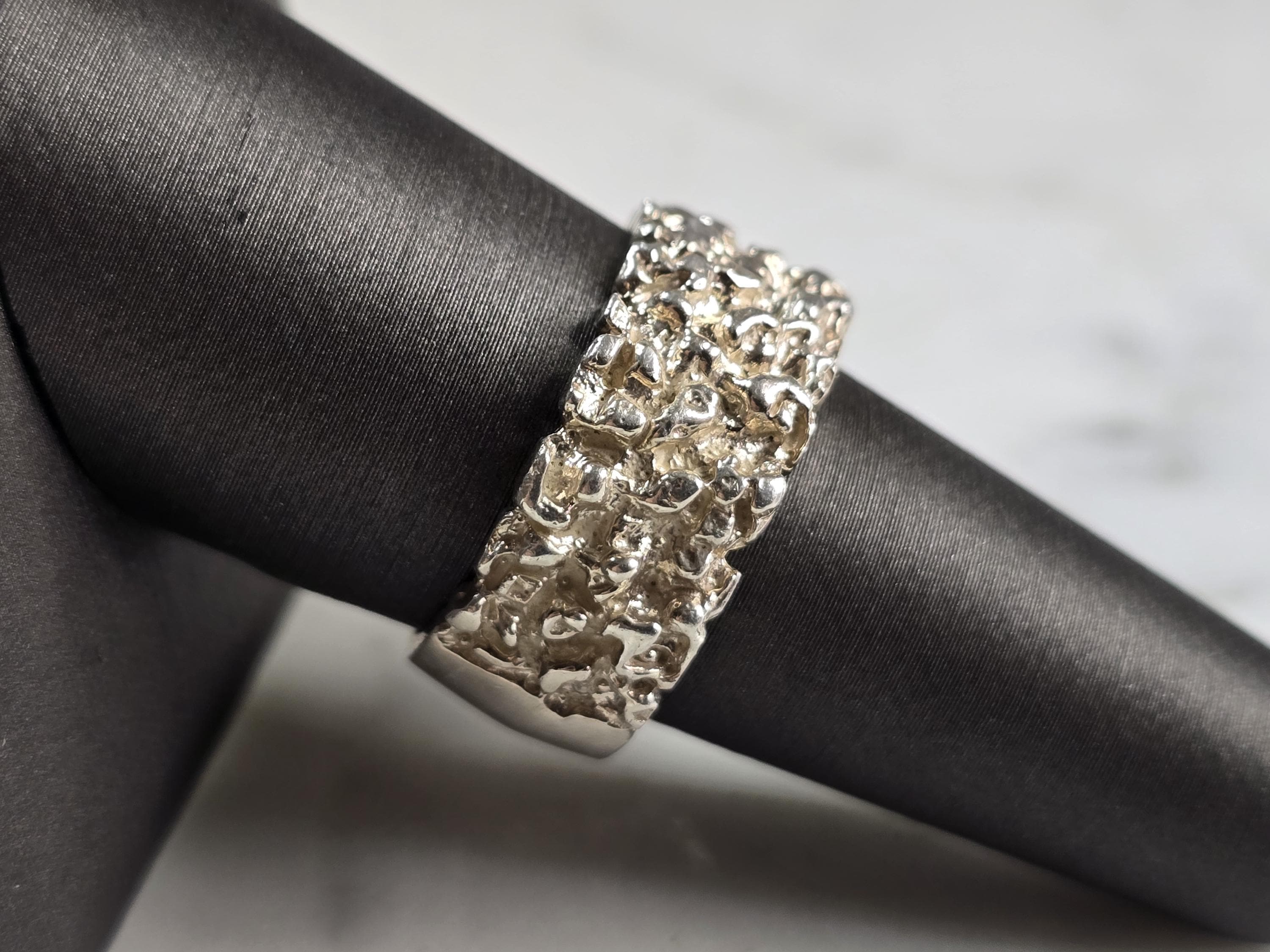 A MENS VINTAGE ESTATE STERLING SILVER NUGGET STYLE RING. THE RING WEIGHS 10.1g AND IS A SIZE 8.5. THE WIDTH OF THE RING IS 3/8". THIS RING WOULD BE A WONDERFUL GIFT FOR THAT SPECIAL SOMEONE. ANY QUESTIONS PLEASE DO NOT HESITATE TO ASK. BE SURE TO CHECK OUT SOME OF MY OTHER GREAT ITEMS UP FOR SALE. THANK YOU.