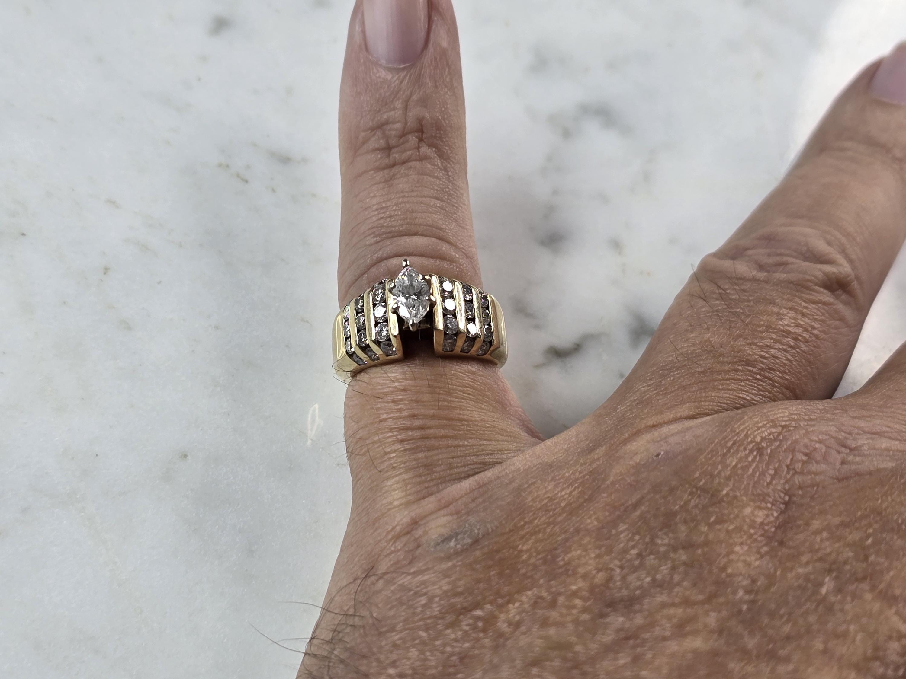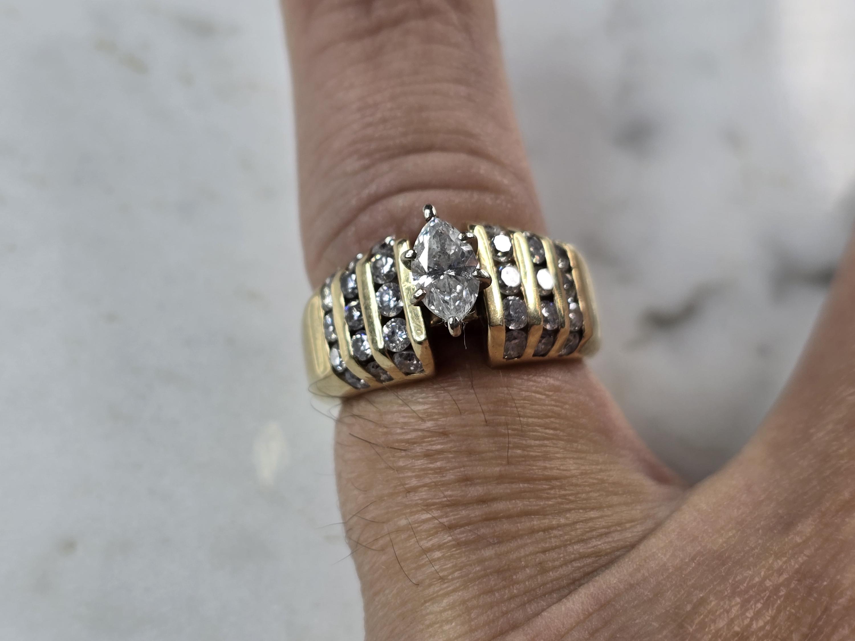 FOR SALE IS THIS WONDERFUL WOMENS 14K YELLOW GOLD RING WITH DIAMONDS. THE CENTER STONE IS ABOUT .5cts SURROUNDED BY ABOUT 1.5cts OF SMALL DIAMOND CHIPS. RING WEIGHS 7.1g TOTAL. THE SIZE OF THE RING IS A 5.5. ANY QUESTIONS PLEASE DO NOT HESITATE TO ASK. BE SURE TO CHECK OUT SOME OF MY OTHER GREAT ITEMS UP FOR SALE. THANK YOU.