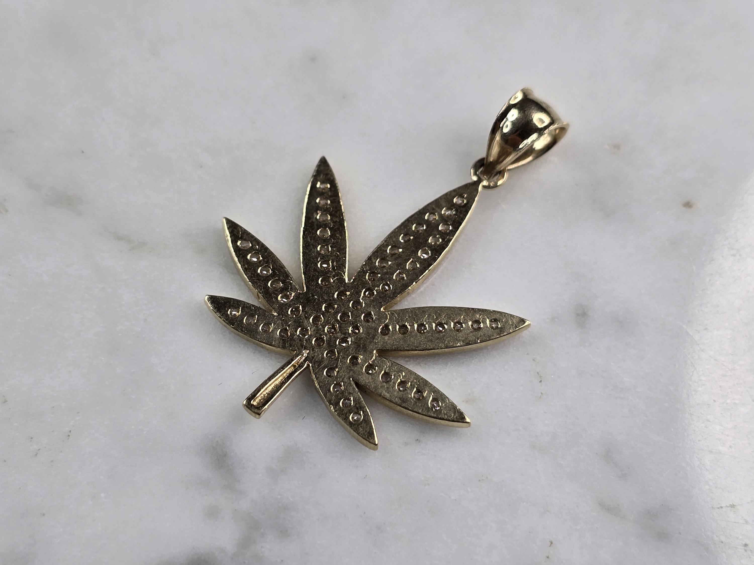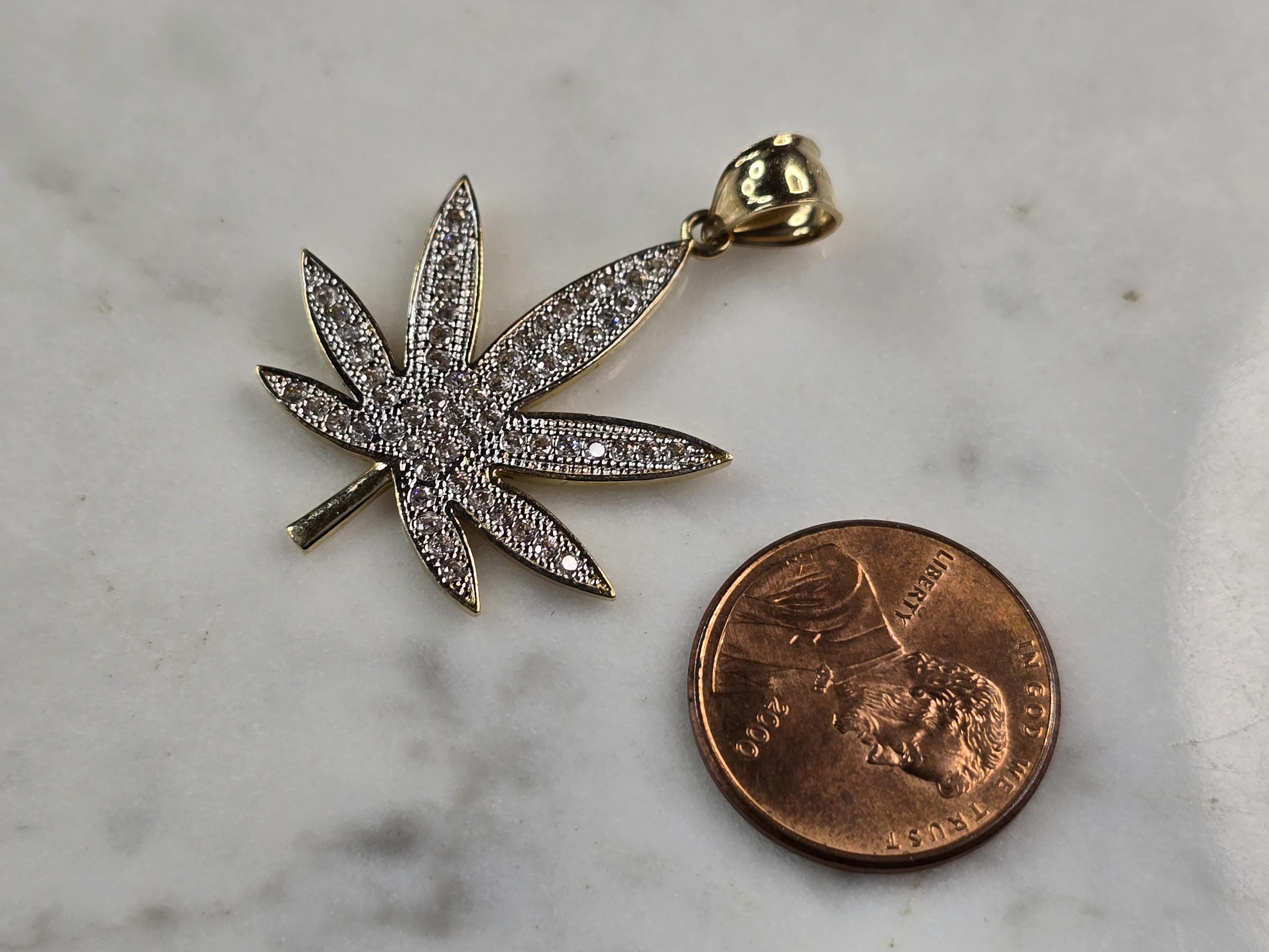 FOR SALE IS THIS BLINGED OUT 14K YELLOW GOLD MARIJUANA LEAF PENDANT ACCENTED WITH CZ CRYSTALS. THE PENDANT WEIGHS 3.7g, AND MEASURES 1 3/8" BY 7/8". PENDANT IS STAMPED "14KM". NOT SURE WHAT THE "M" MEANS, COULD BE PART OF A MAKERS MARK. PENDANT HAS ALSO BEEN TESTED. MAKES A GREAT GIFT FOR THAT SOMEONE SPECIAL. IF ANY QUESTIONS, PLEASE ASK. BE SURE TO CHECK OUT OUR OTHER ITEMS FOR SALE.