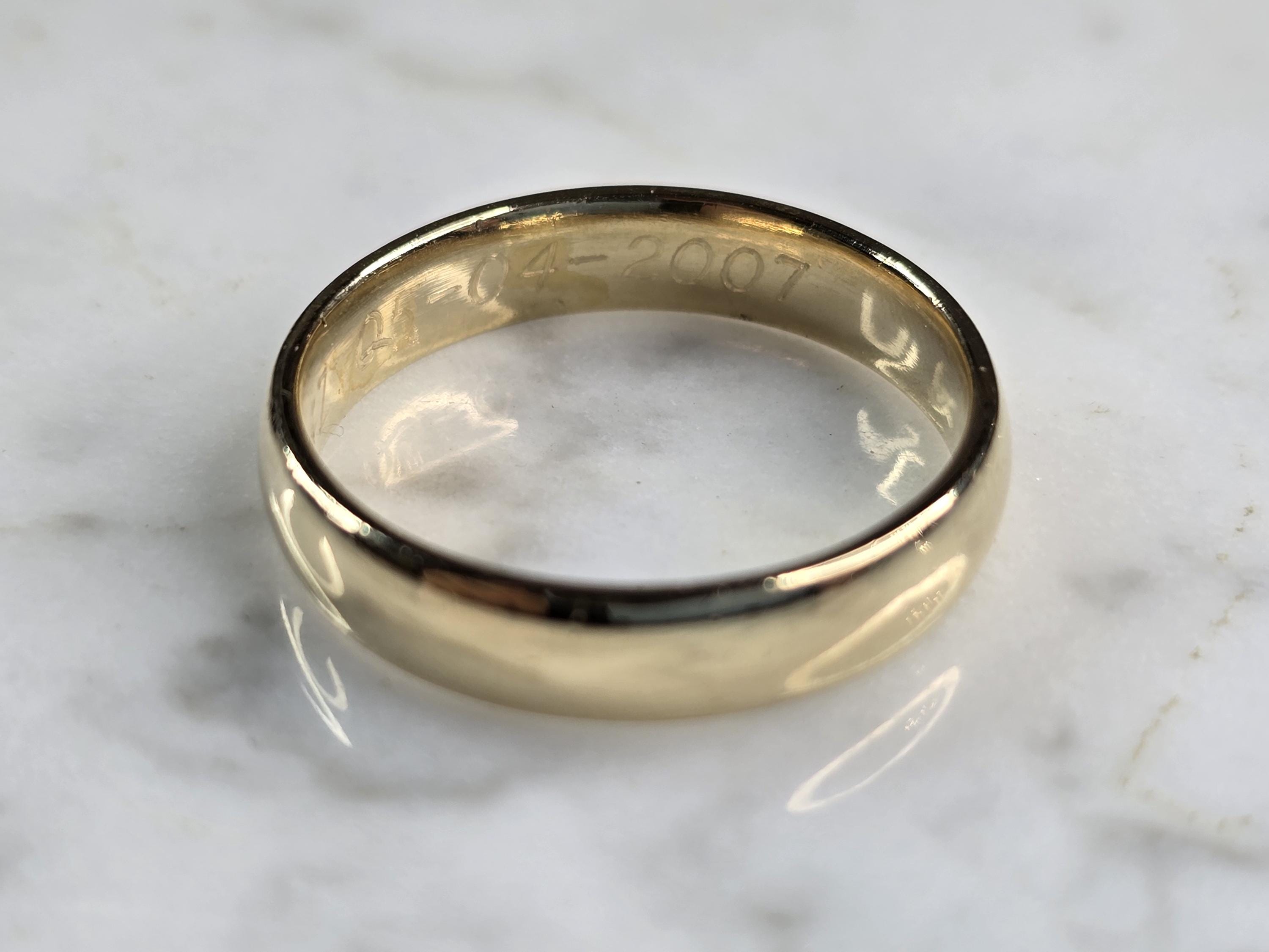 A MEN'S VINTAGE ESTATE 14K GOLD WEDDING BAND THAT WEIGHS 6.7g. THE RING SIZE IS A 11.5, AND IS JUST UNDER 3/16" WIDE. RING IS NOT STAMPED BUT IT HAS BEEN TESTED. RING ALSO HAS SOME PERSONALIZED ETCHING ON THE INSIDE OF THE BAND, ALL OF WHICH CAN EASILY BE TAKEN OFF BY AN EXPERIENCED JEWELRY REPAIR PERSON. ANY QUESTIONS PLEASE DONT HESITATE TO ASK. BE SURE TO CHECK OUT SOME OF MY OTHER GREAT ITEMS UP FOR SALE. THANK YOU.