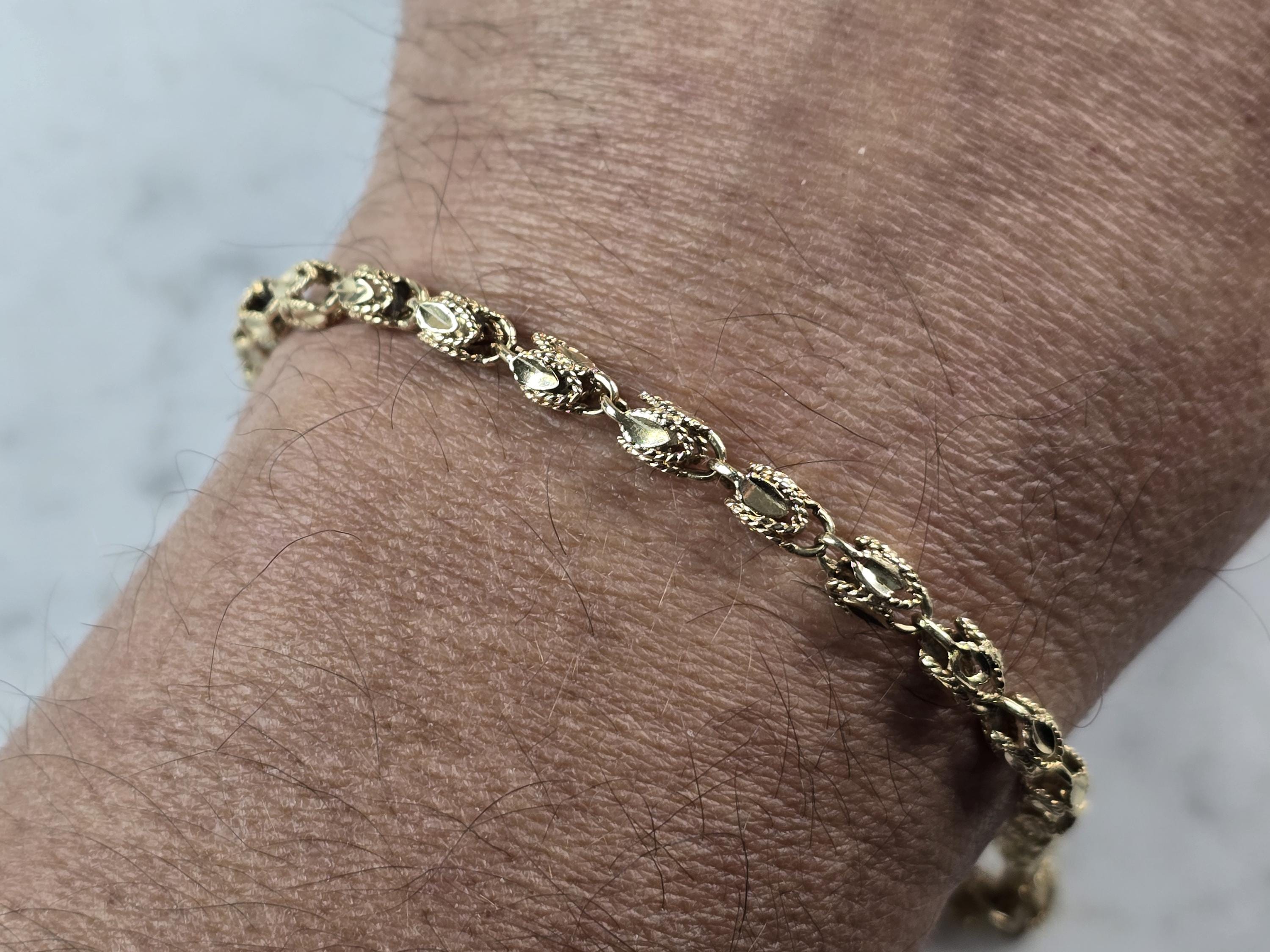 FOR SALE IS THIS STUNNING WOMEN'S 14k YELLOW GOLD BRACELET THAT WEIGHS 6.9g. THE BRACELET MEASURES ABOUT 1/8" WIDE AND 7 1/4" LONG. PIECE IS MARKED AND HAS BEEN TESTED. ANY OTHER QUESTIONS PLEASE ASK. BE SURE TO CHECK OUT SOME OF MY OTHER GREAT ITEMS UP FOR SALE. THANK YOU.