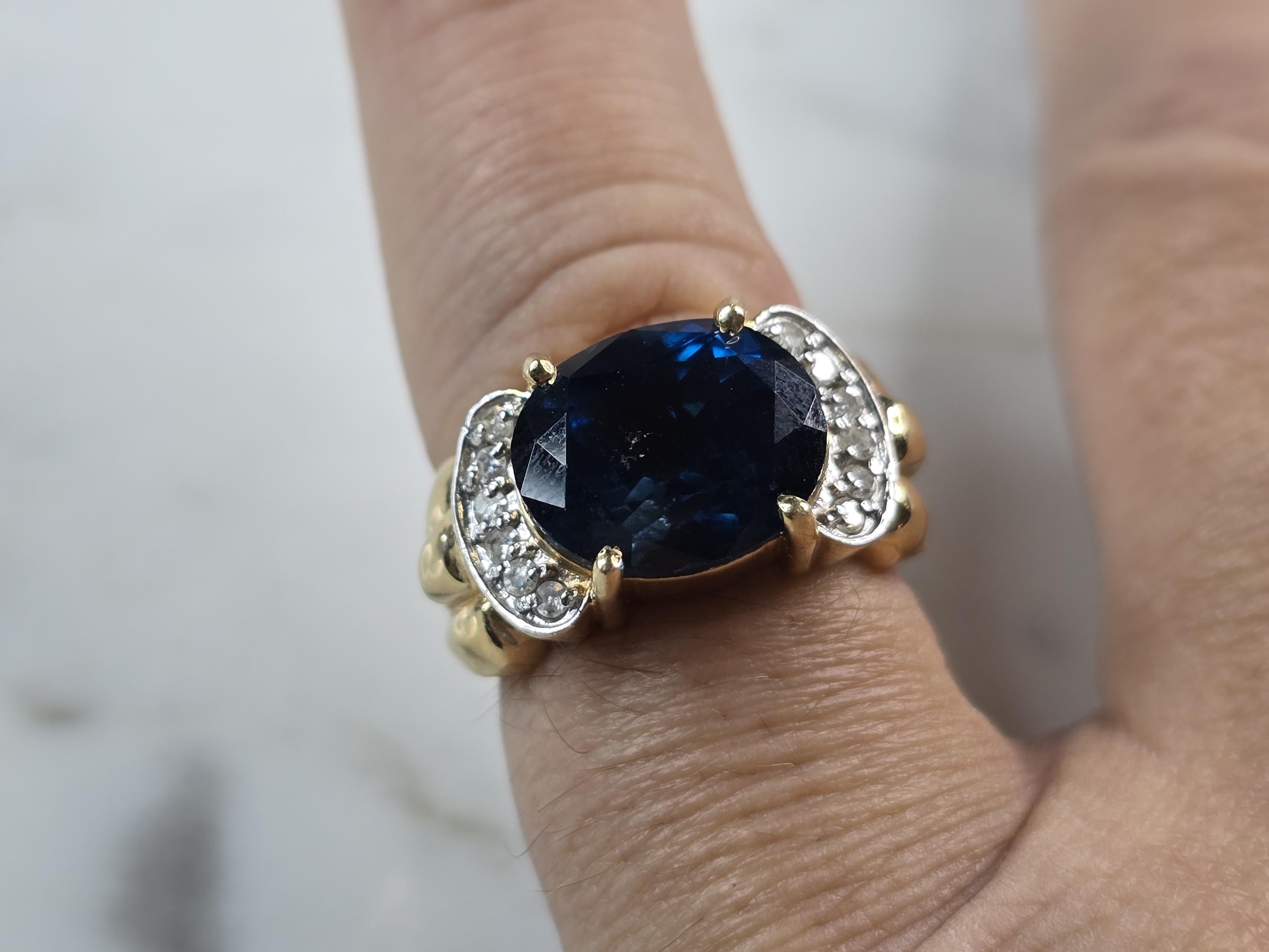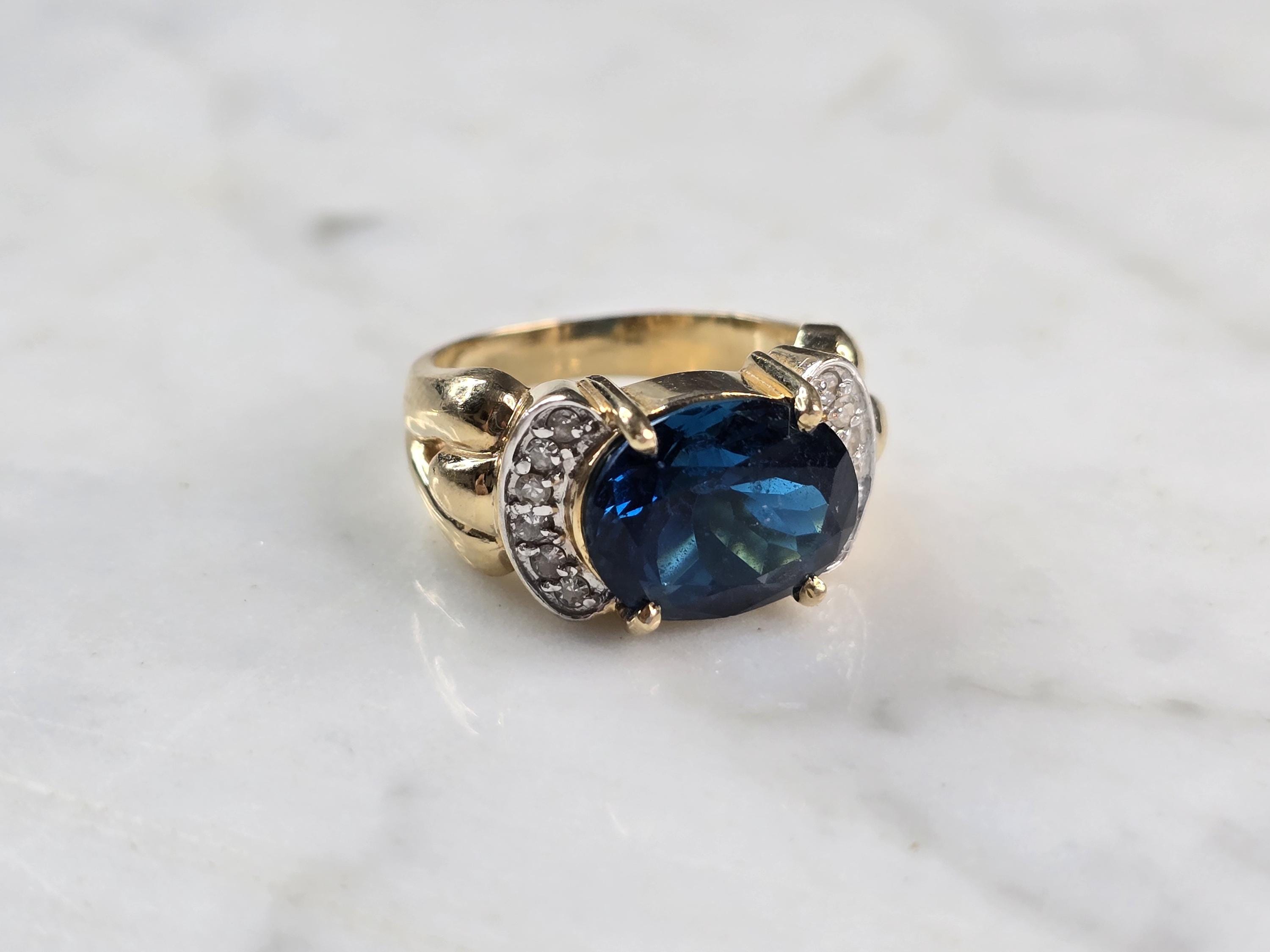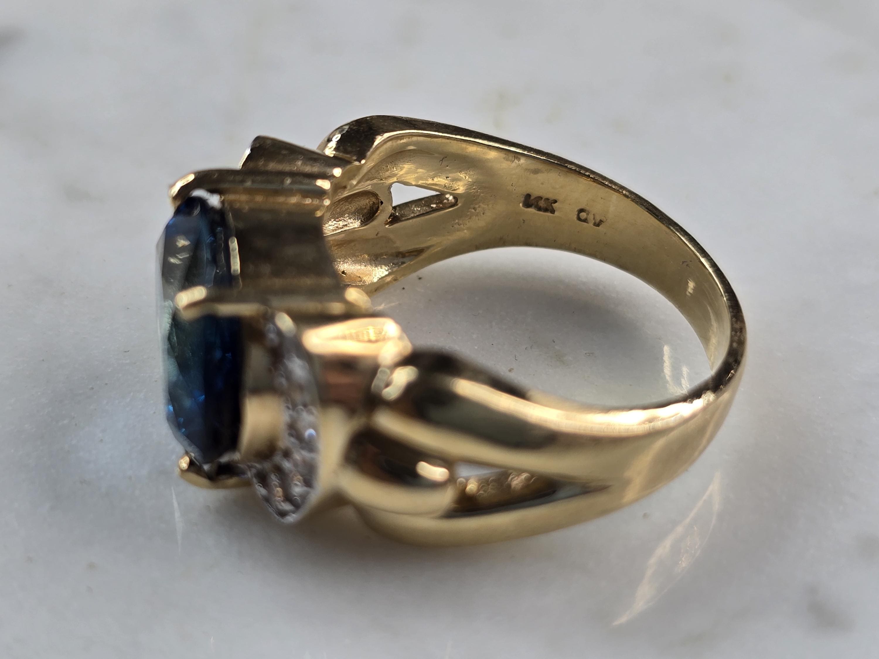 A WOMENS VINTAGE ESTATE 14K YELLOW GOLD RING WITH WHAT APPEARS TO BE A BLUE ZIRCON STONE ACCENTED BY TINY DIAMONDS. DIAMONDS ARE ABOUT .36cts. NOT SURE IF IT IS A REAL ZIRCON OR MAN MADE. THE RING WEIGHS 9.3g AND IS A SIZE 6.25. ANY QUESTIONS PLEASE DO NOT HESITATE TO ASK. BE SURE TO CHECK OUT SOME OF MY OTHER GREAT ITEMS UP FOR SALE. THANK YOU.