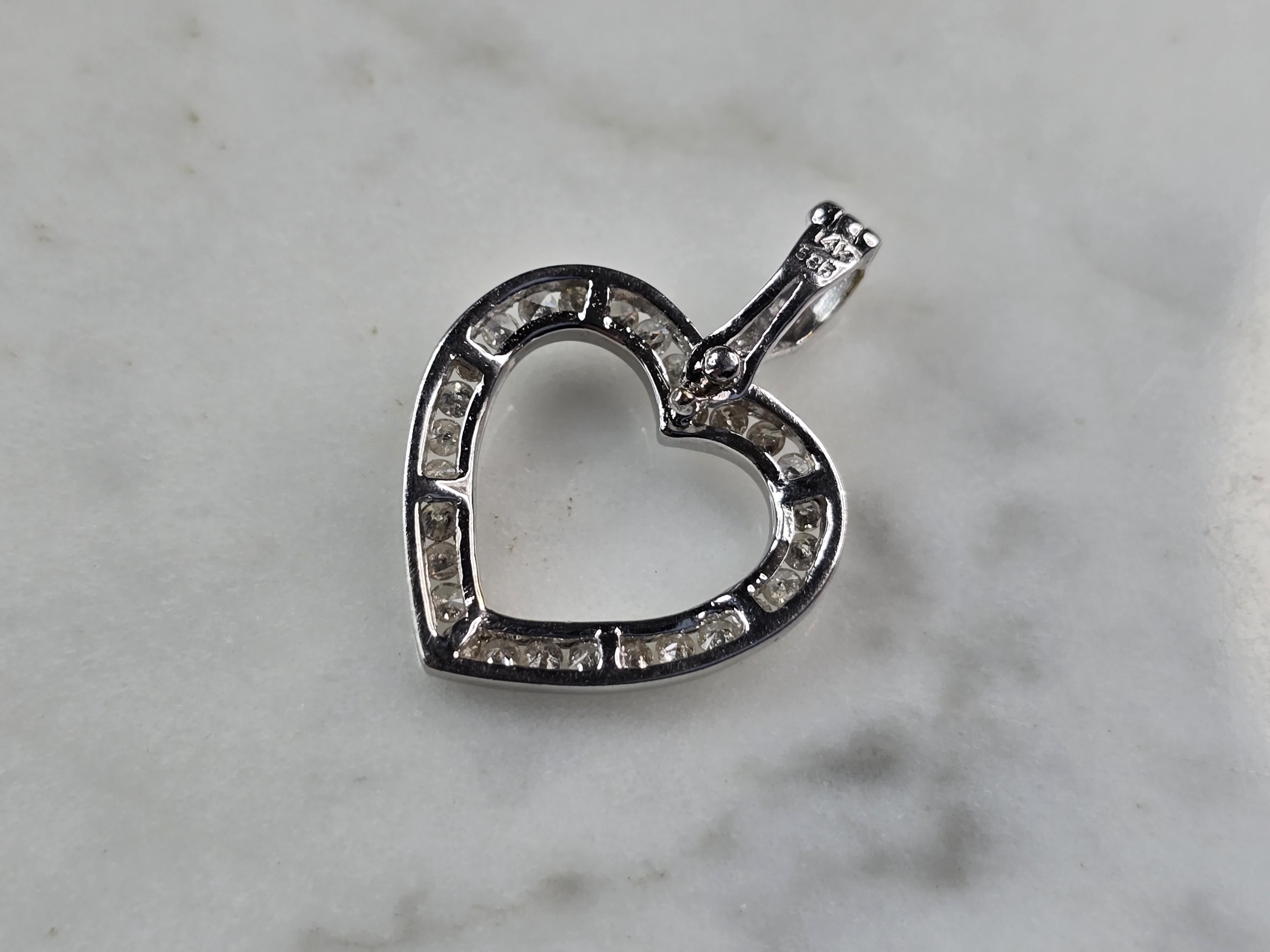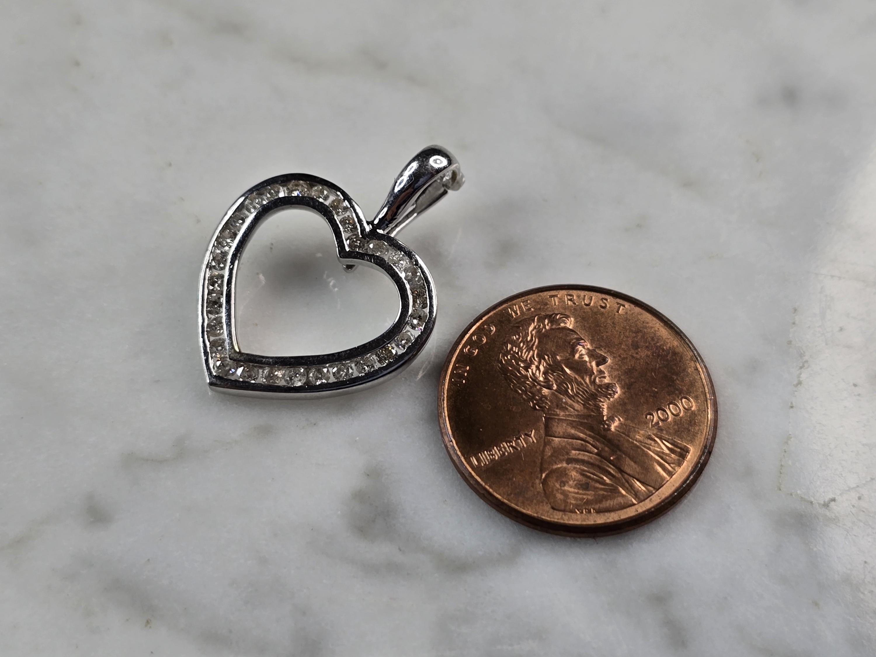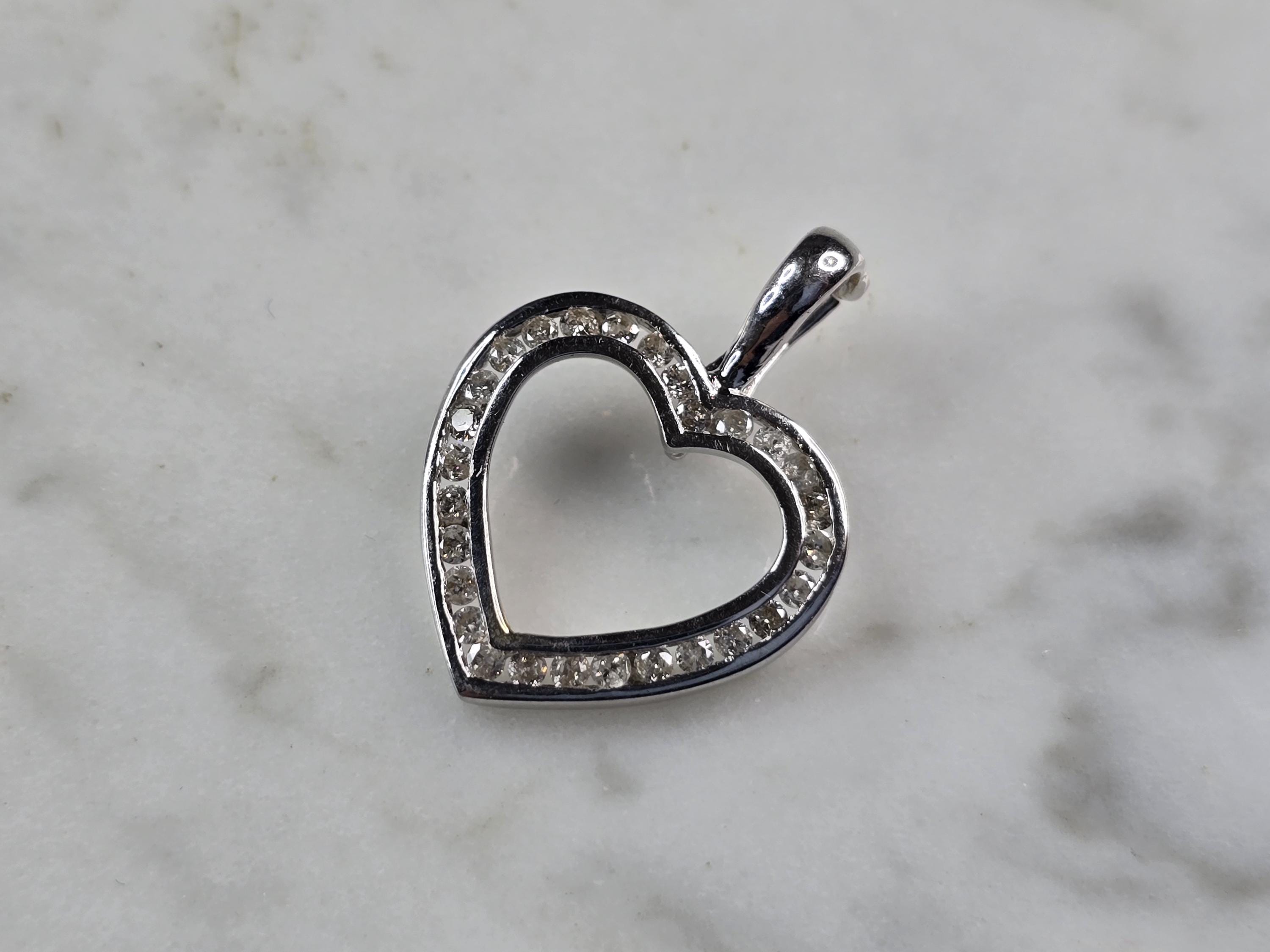 A WOMENS VINTAGE ESTATE 10K WHITE GOLD HEART PENDANT WITH DIAMONDS. PENDANT HAS ABOUT .84cts IN IT AND WEIGHS 2.0g. PENDANT MEASURES 5/8" BY 1". WOULD MAKE A LOVELY GIFT FOR THAT SOMEONE SPECIAL. ANY OTHER QUESTIONS PLEASE ASK. BE SURE TO CHECK OUT SOME OF MY OTHER GREAT ITEMS UP FOR SALE. THANK YOU