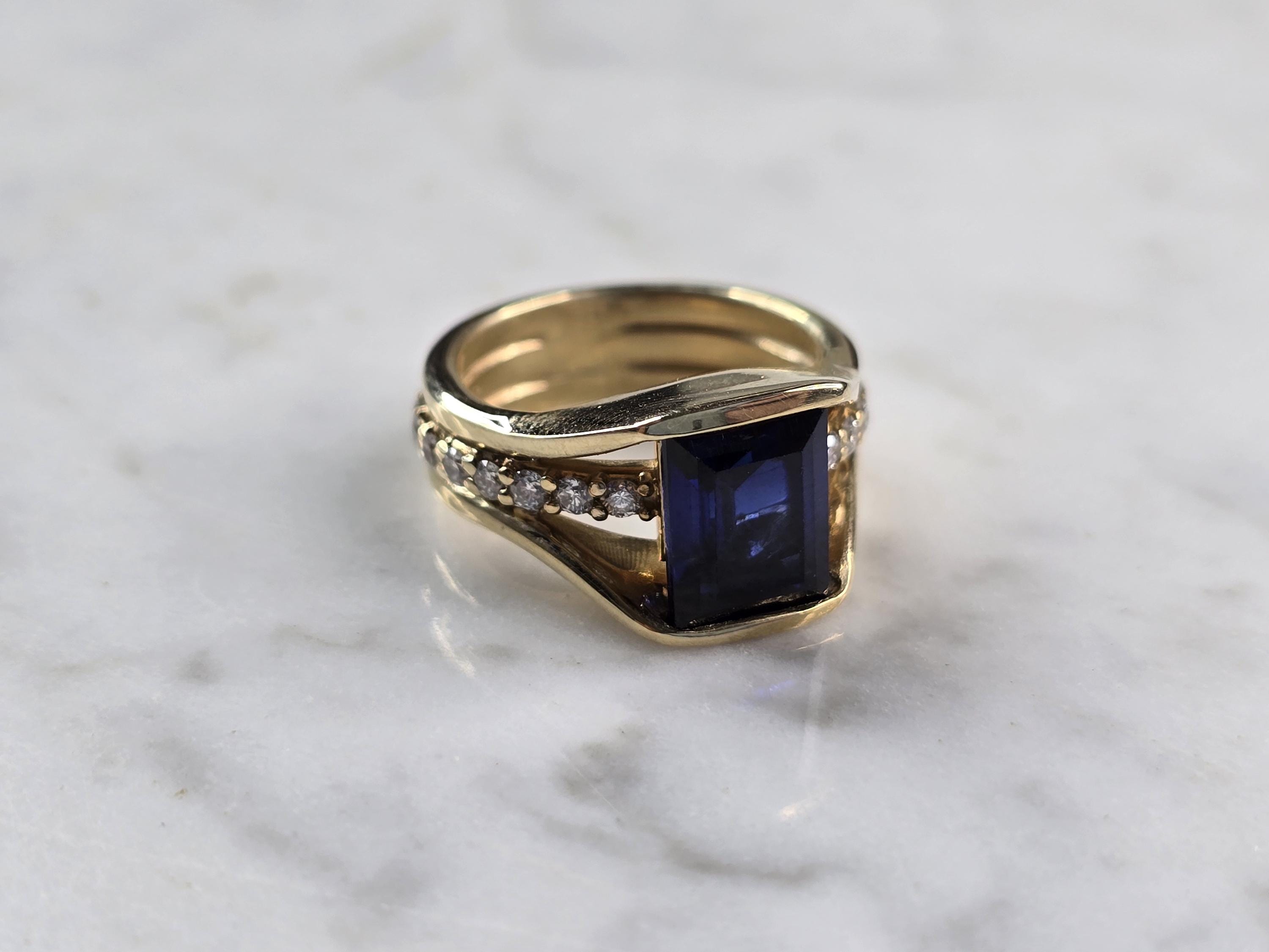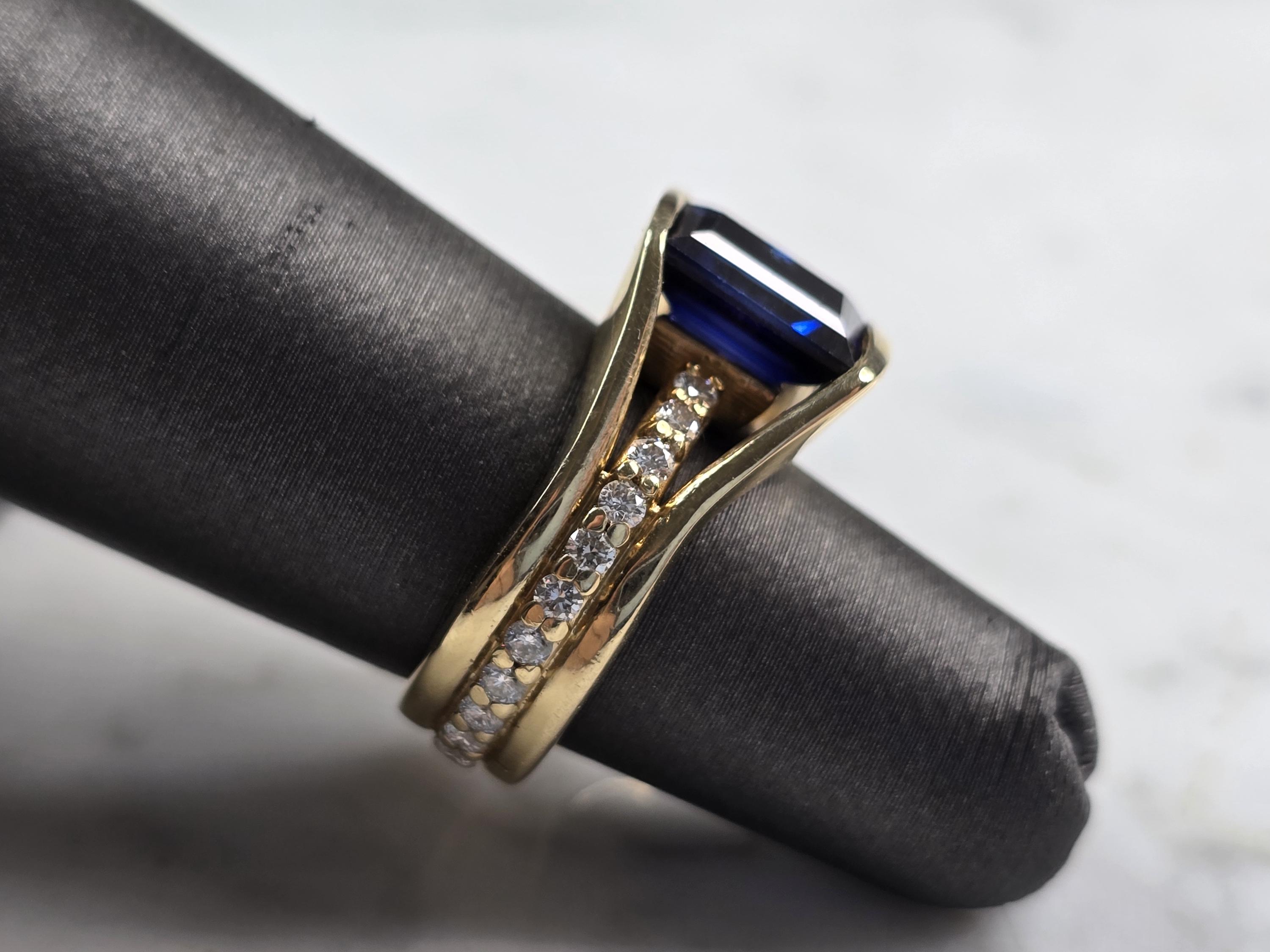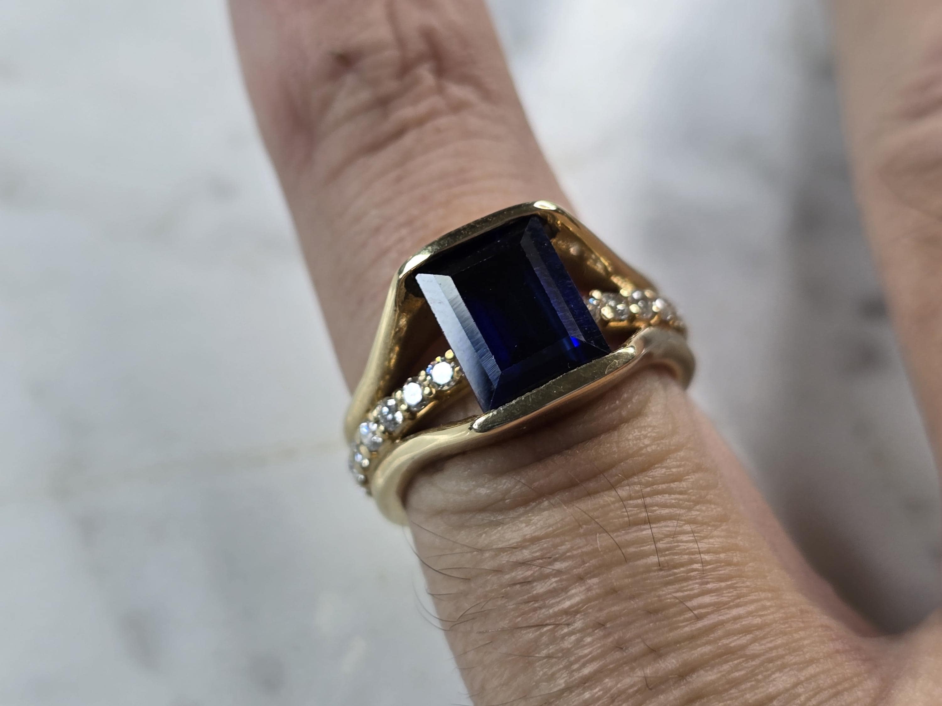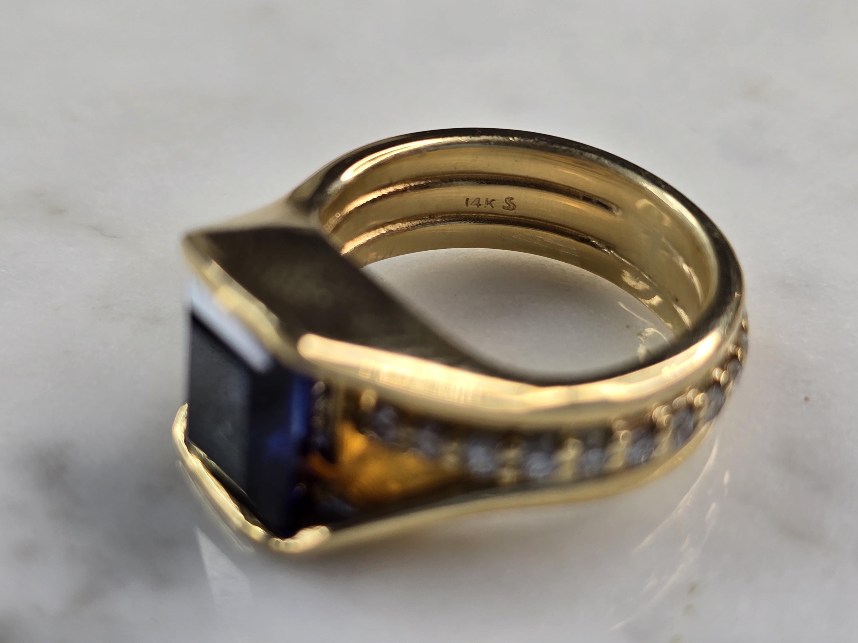 FOR SALE IS THIS WOMENS VINTAGE ESTATE 14K GOLD SAPPHIRE & DIAMOND RING. THE RING IS A SIZE 4.5 AND WEIGHS 9.3g. THERE ARE ABOUT .66cts OF DIAMONDS. NOT SURE IF THE SAPPHIRE STONE IS REAL OR MAN MADE. SAPPHIRE IS ABOUT 2.5cts. RING IS MARKED "14K". THE RING MAKES A BEAUTIFUL, IMPRESSIVE GIFT FOR THAT SOMEONE SPECIAL. ANY OTHER QUESTIONS, PLEASE ASK. BE SURE TO CHECK OUT SOME OF MY OTHER GREAT ITEMS UP FOR SALE. THANK YOU