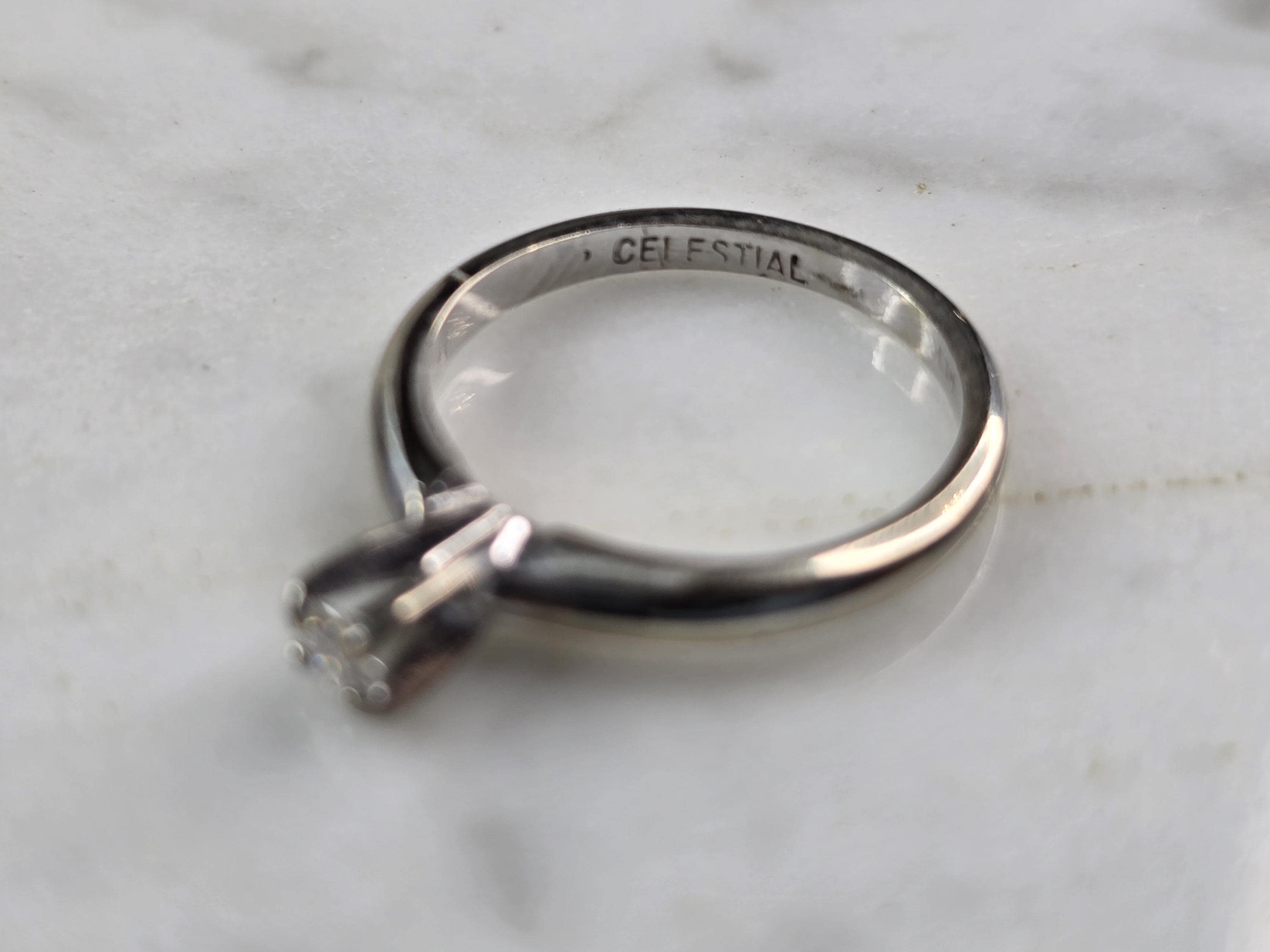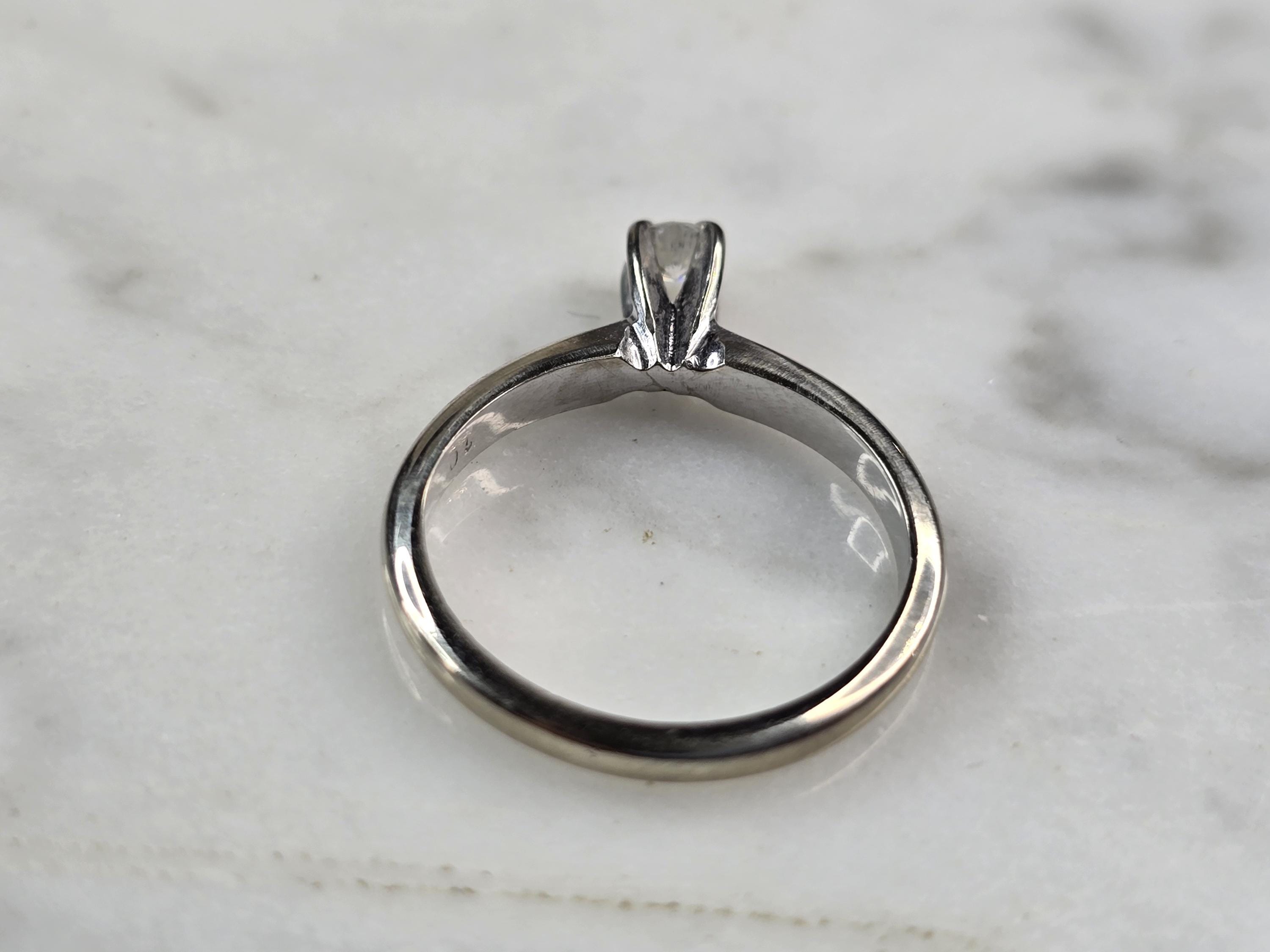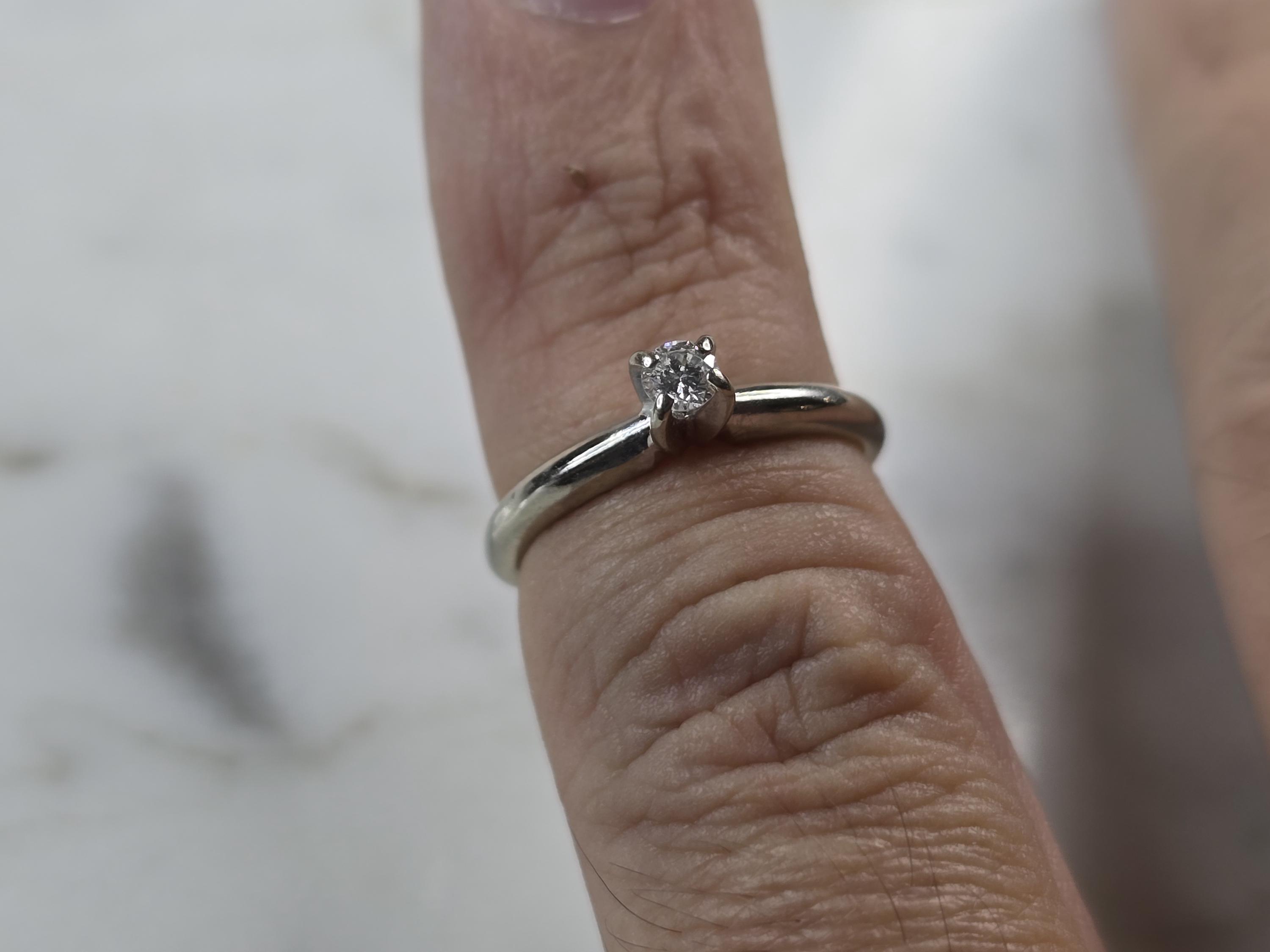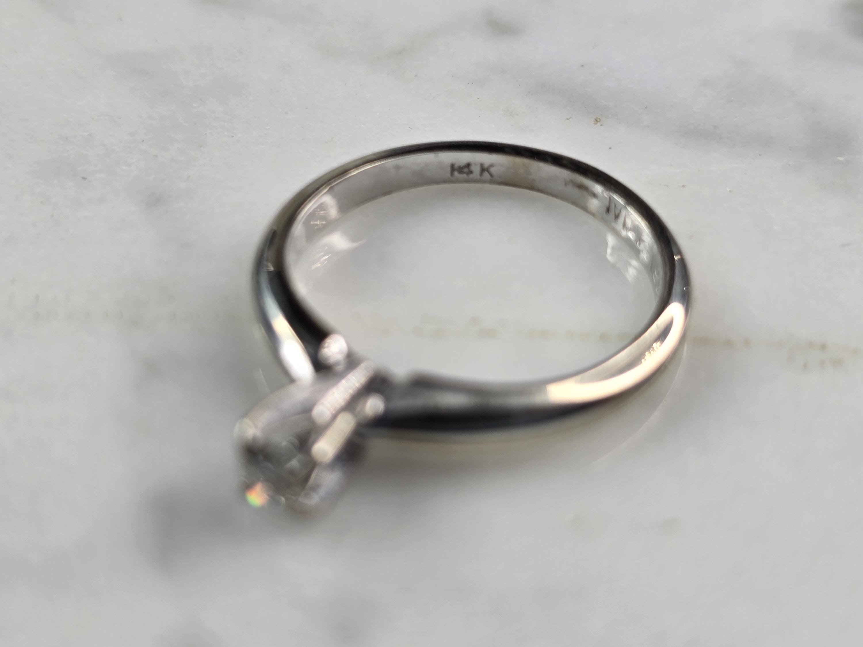 FOR SALE IS THIS WONDERFUL WOMEN'S 14K WHITE GOLD RING WITH A BEAUTIFUL .10 CT. ROUND DIAMOND. THE RING WEIGHS 1.9g. THE SIZE OF THE RING IS A 3.25. THE DIAMOND HAS A BEAUTIFUL SPARKLE TO IT, AND WOULD MAKE A LOVELY GIFT FOR THAT SOMEONE SPECIAL. ANY QUESTIONS PLEASE DO NOT HESITATE TO ASK. BE SURE TO CHECK OUT SOME OF MY OTHER GREAT ITEMS UP FOR SALE. THANK YOU.