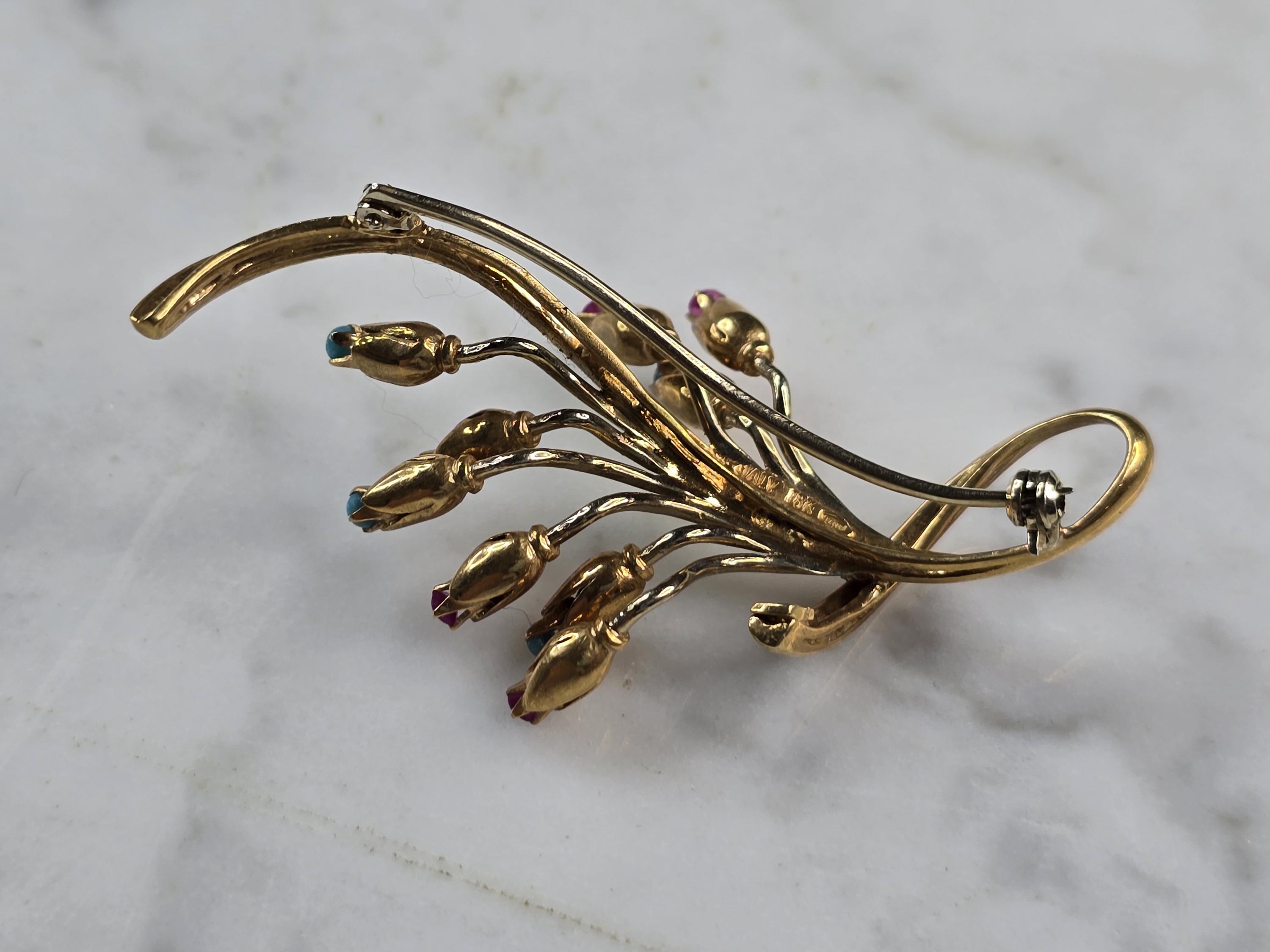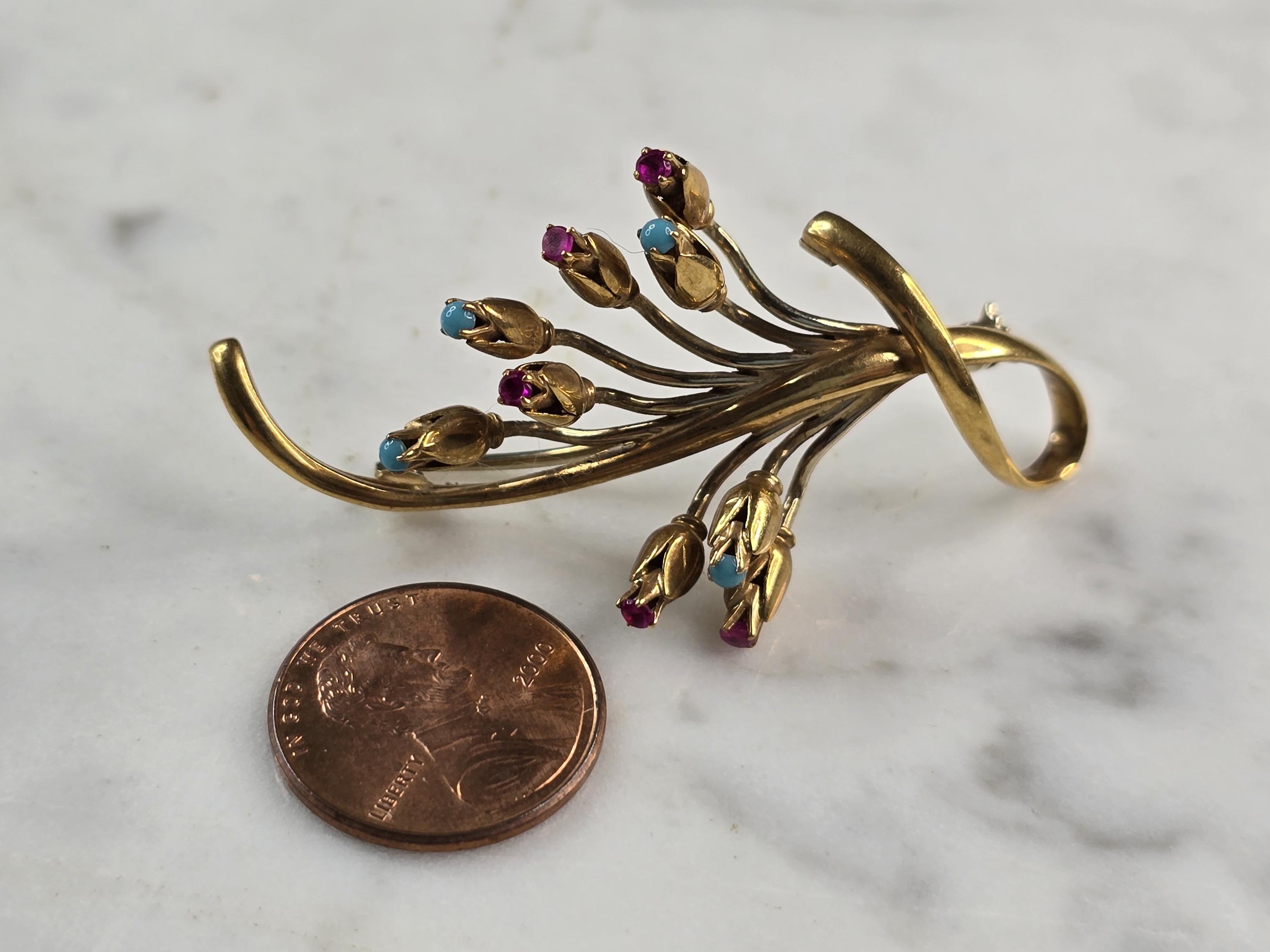 A WOMENS VINTAGE ESTATE 14K YELLOW GOLD RUBIES AND TURQUOISE FLOWER BROOCH. NOT SURE IF THE STONES ARE NATURAL OR MAN MADE. THE BROOCH MEASURES 2 1/8" LONG BY 1 1/8" WIDE, AND WEIGHS 9.7g. WOULD MAKE A GREAT GIFT FOR THAT SPECIAL SOMEONE. ANY QUESTIONS PLEASE DO NOT HESITATE TO ASK. BE SURE TO CHECK OUT SOME OF MY OTHER GREAT ITEMS UP FOR SALE. THANK YOU.