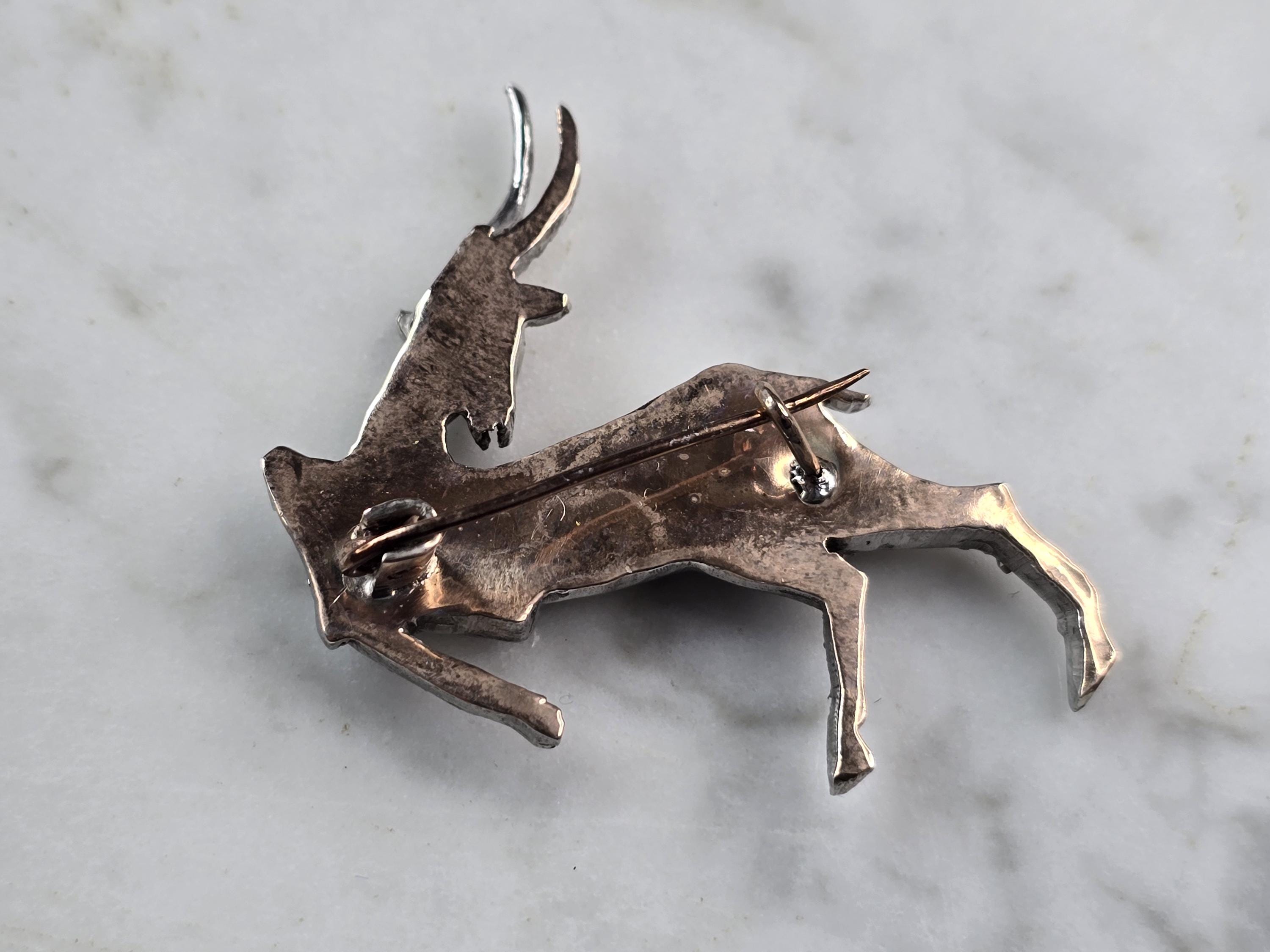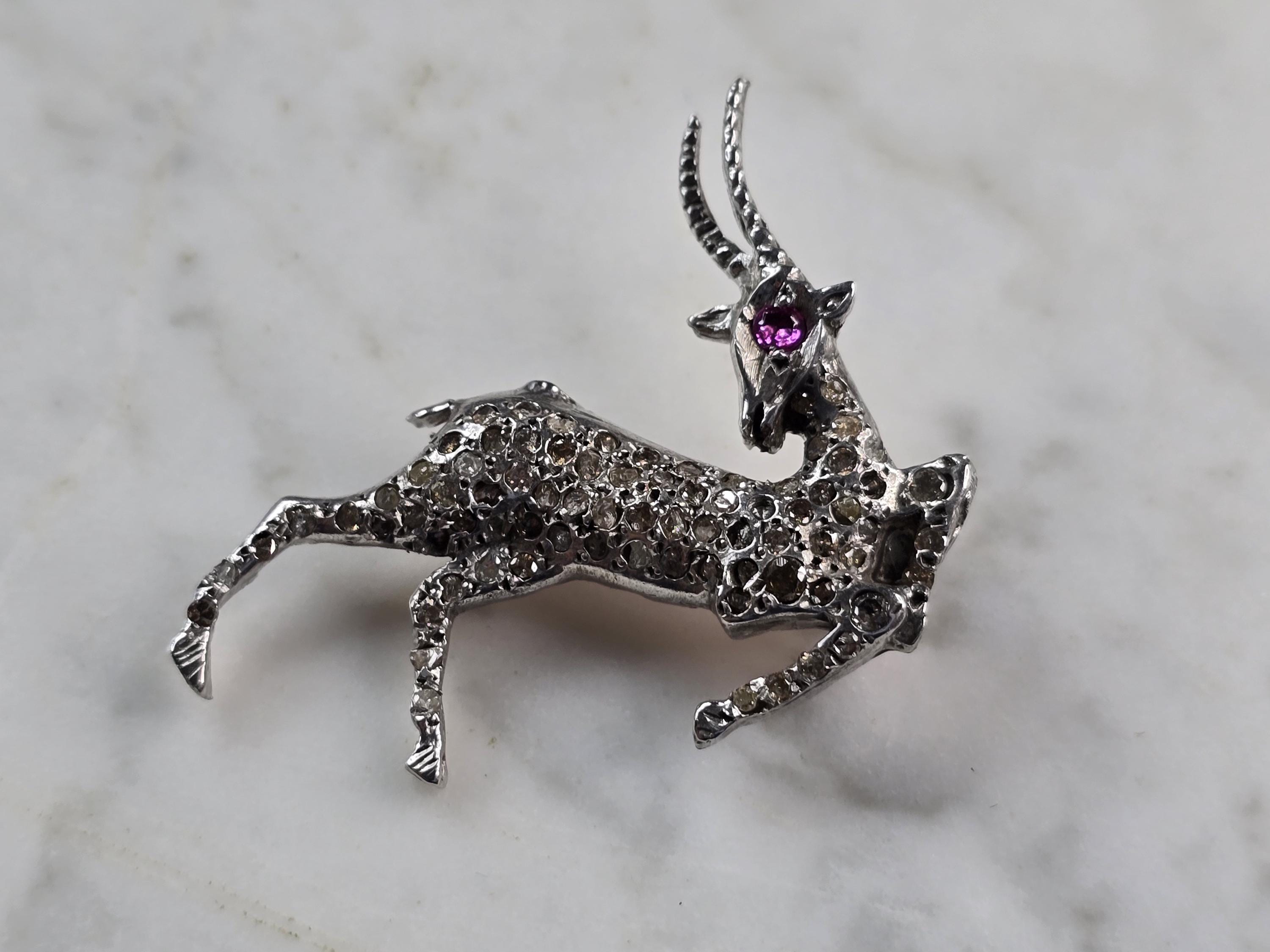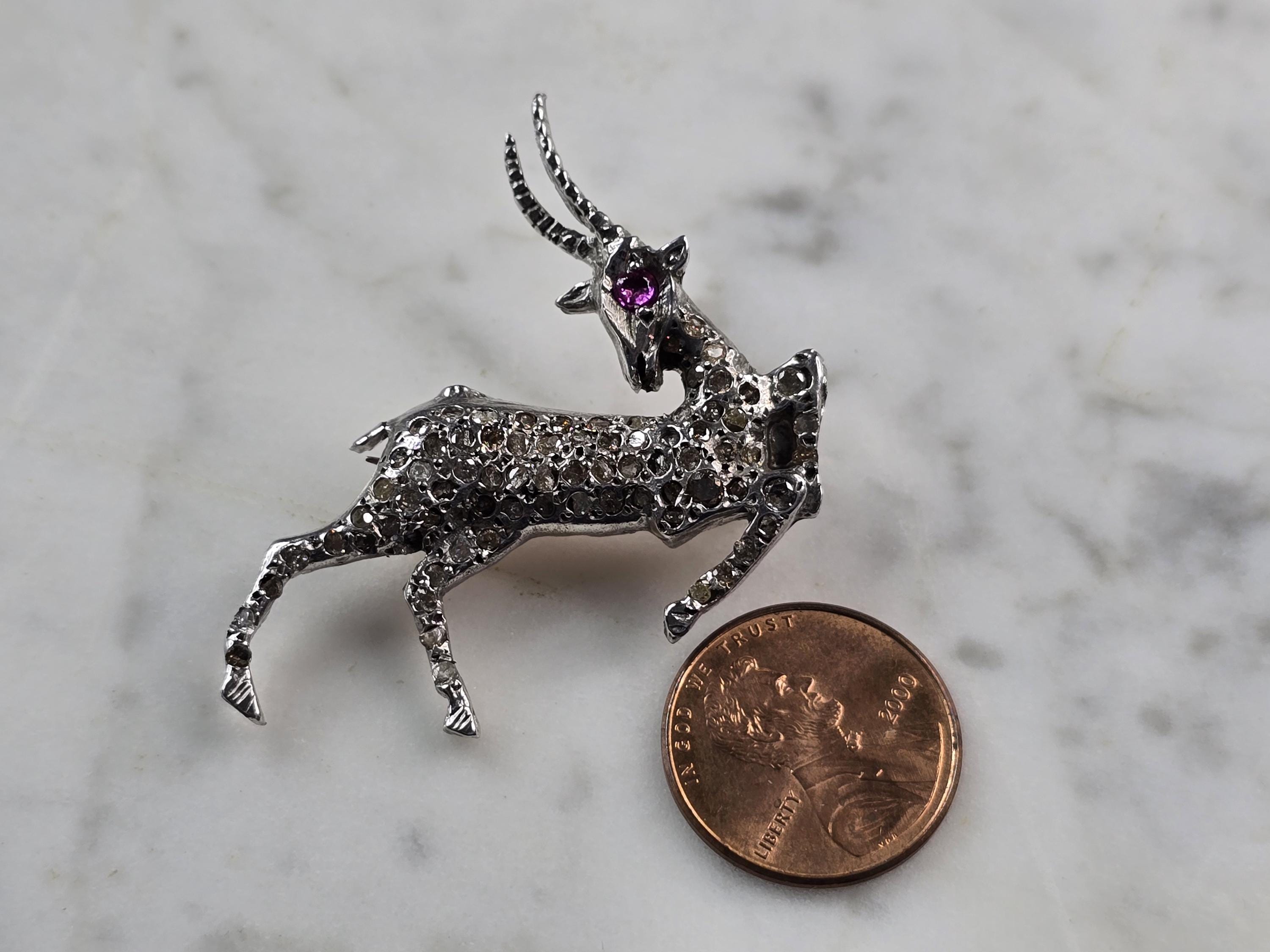 A womens vintage estate 14k white gold diamond stag brooch. Piece weighs 9.1g and measures 1 3/4" long by 1 3/4" wide. There are about 2.35cts of diamonds. There are 3 diamonds missing, however you can only tell when looking under a magnifying glass. Some of the other diamonds do have some chips. I do believe they were intended to be like that for the holes that the diamonds are set in are not perfectly round. The eye of the stag tested as ruby. Piece is not marked but it has been tested.