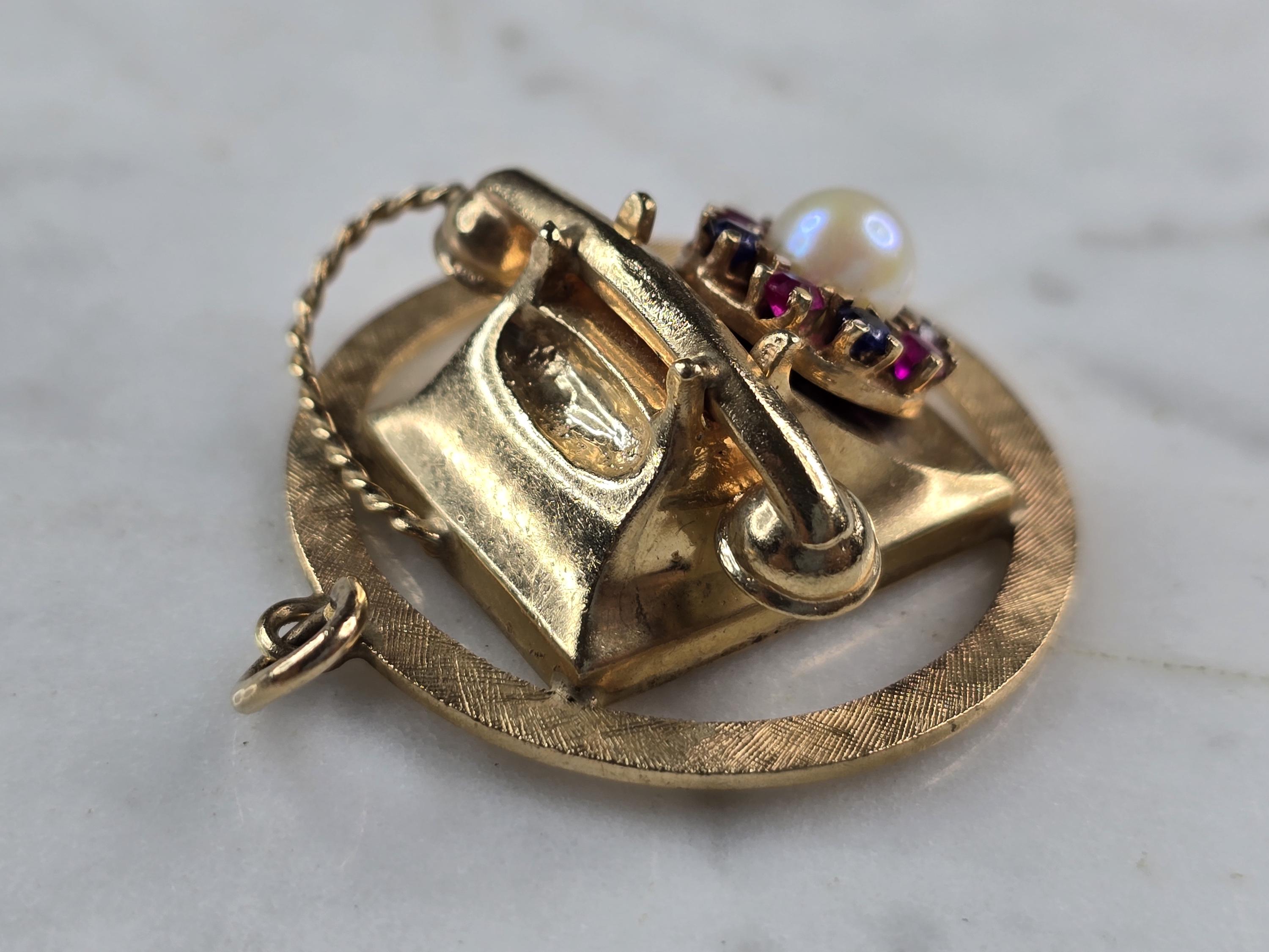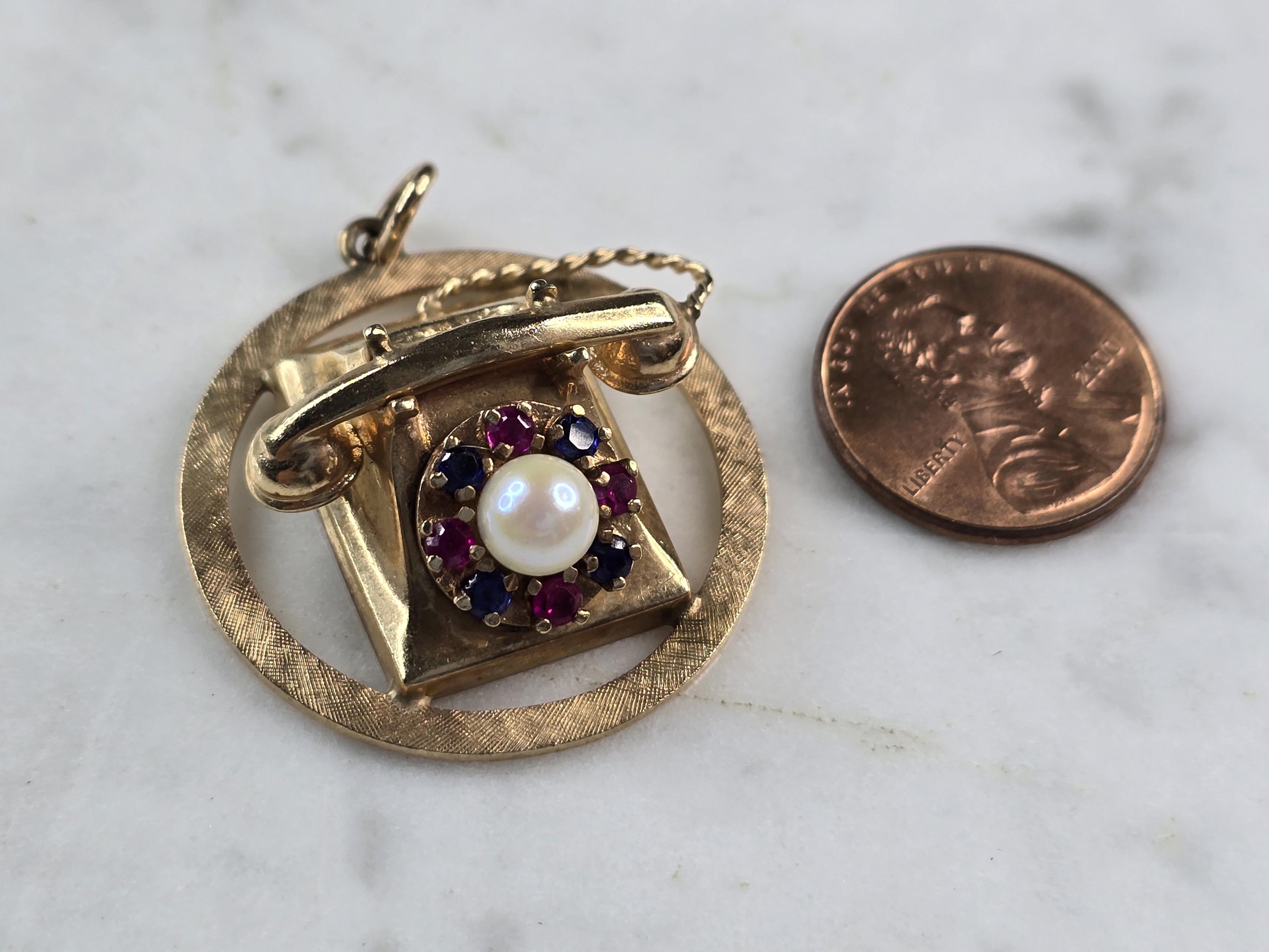 A WOMENS VINTAGE ESTATE 14K YELLOW GOLD RUBIES AND SAPPHIRE TELEPHONE BROOCH. NOT SURE IF THE STONES ARE NATURAL OR MAN MADE. THE BROOCH MEASURES 1 1/2" LONG BY 1 1/4" WIDE, AND WEIGHS 12.2g. WOULD MAKE A GREAT GIFT FOR THAT SPECIAL SOMEONE. ANY QUESTIONS PLEASE DO NOT HESITATE TO ASK. BE SURE TO CHECK OUT SOME OF MY OTHER GREAT ITEMS UP FOR SALE. THANK YOU.