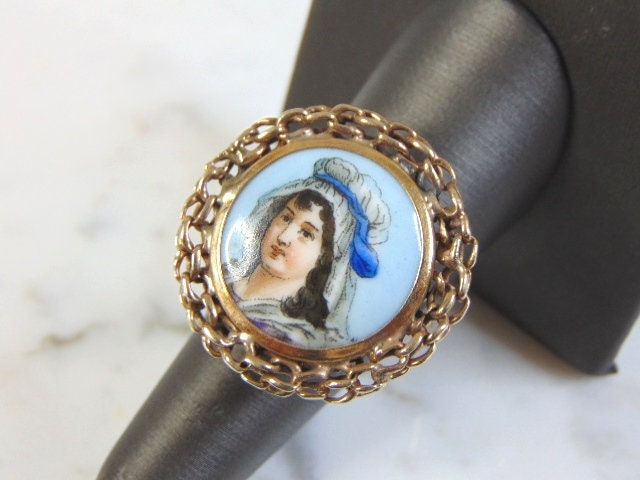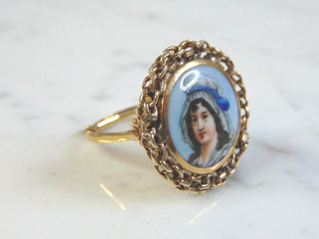 FOR SALE IS THIS LOVELY VINTAGE 14K YELLOW GOLD HAND PAINTED PORCELAIN RING. THE RING WEIGHS 12.1g. THE RING SIZE IS 8.5. WOULD MAKE A GREAT GIFT FOR THAT SOMEONE SPECIAL. IF ANY QUESTIONS, PLEASE ASK. BE SURE TO CHECK OUT SOME OF OUR OTHER GREAT ITEMS FOR SALE.